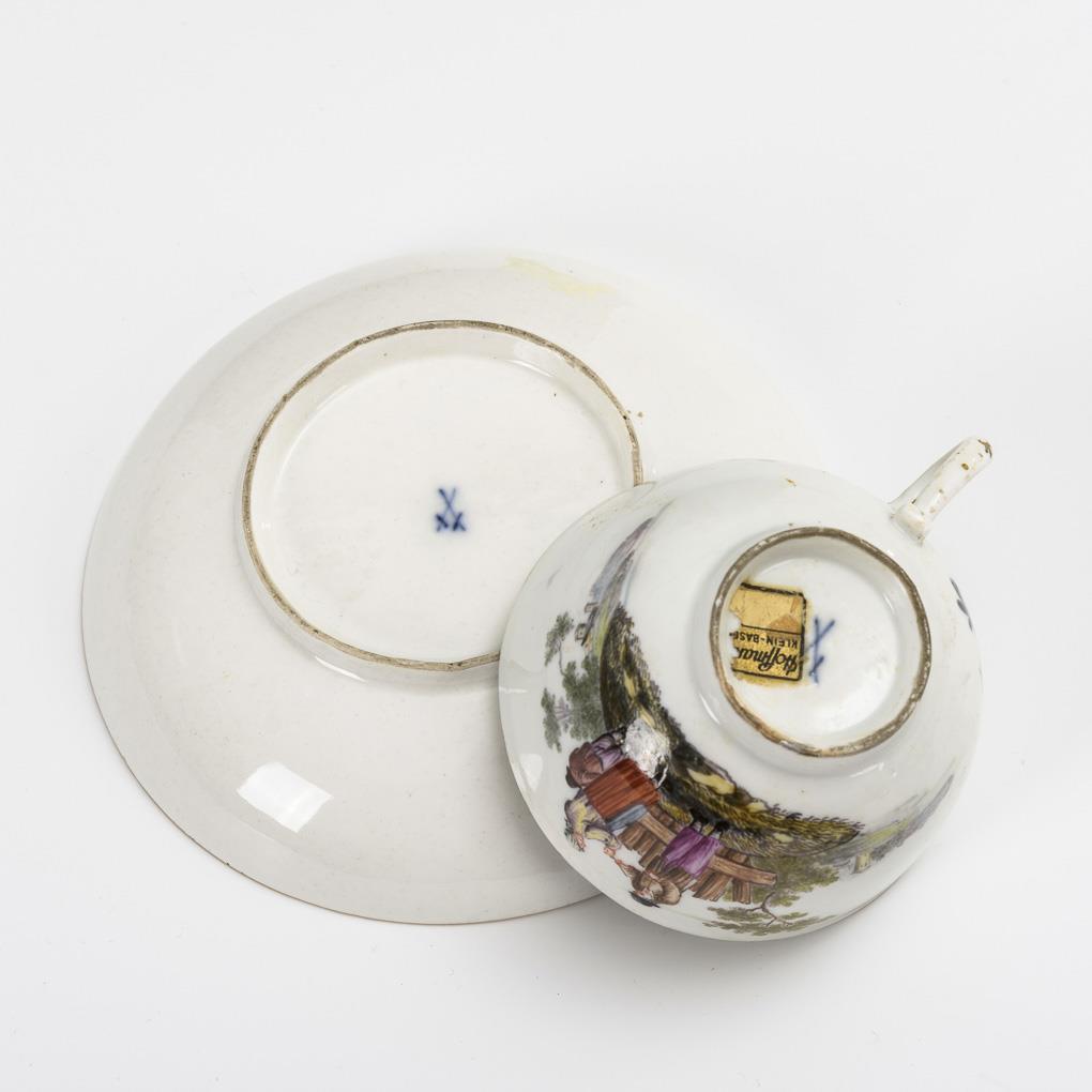 Bellied cup with ear handle. On the front side the depiction of a landscape piece with peasant family, in the mirror of the saucer the depiction of a peasant woman washing clothes and the peasant with child on his lap. Restoration on the rim of the cup, minimal gold abrasion.