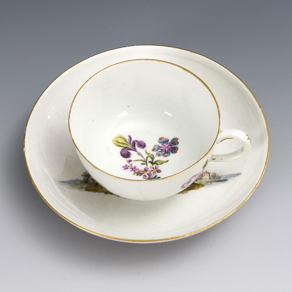 Polychrome painted, gold decorated. H cup 4.5 cm, Ø original saucer 13.5 cm.