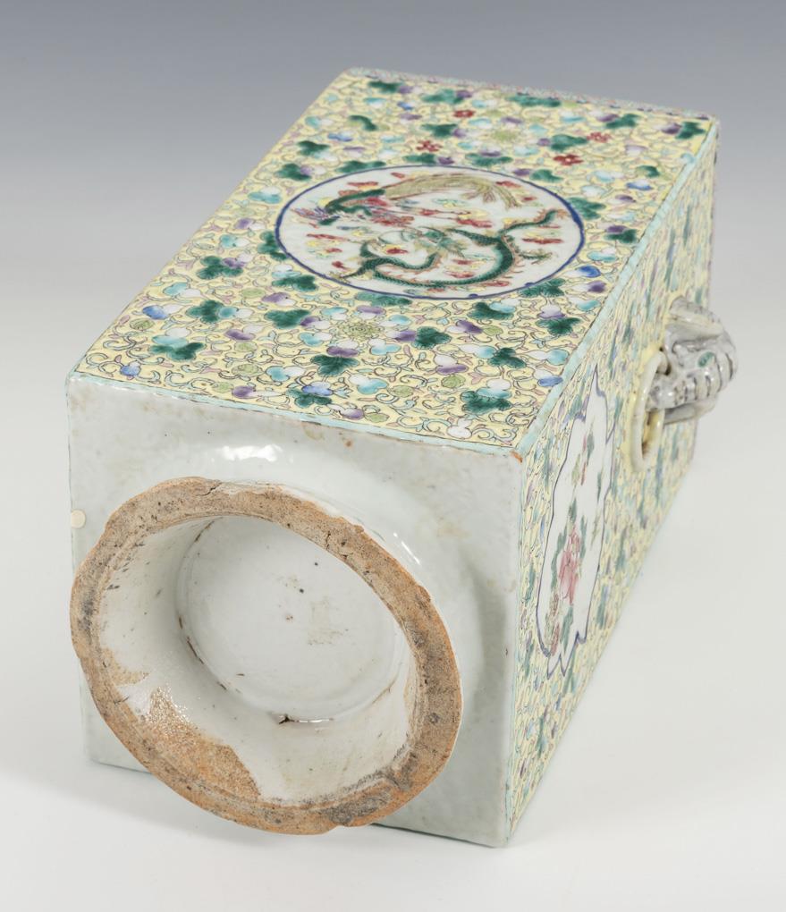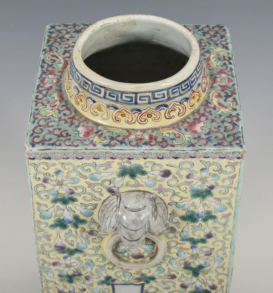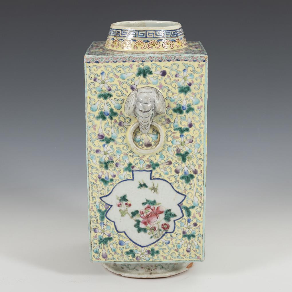 Polychrome enamel painting with floral and dragon cartouches in vine work. Two elephant heads as handles. Several chips on the round base, neck restored.