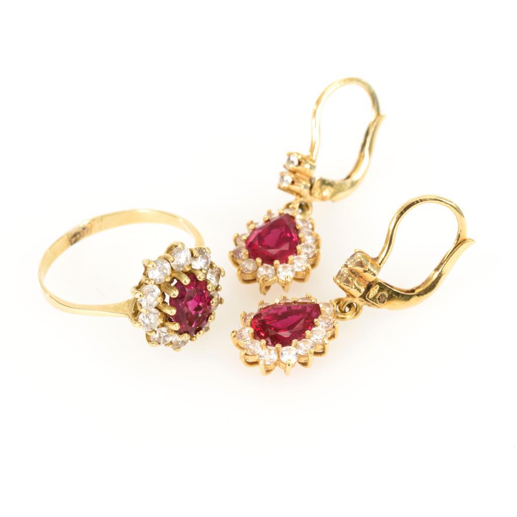 Ohrhängerpaar und Ring mit roten und farblosen Steinen