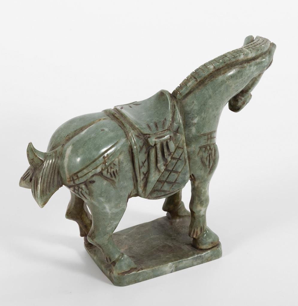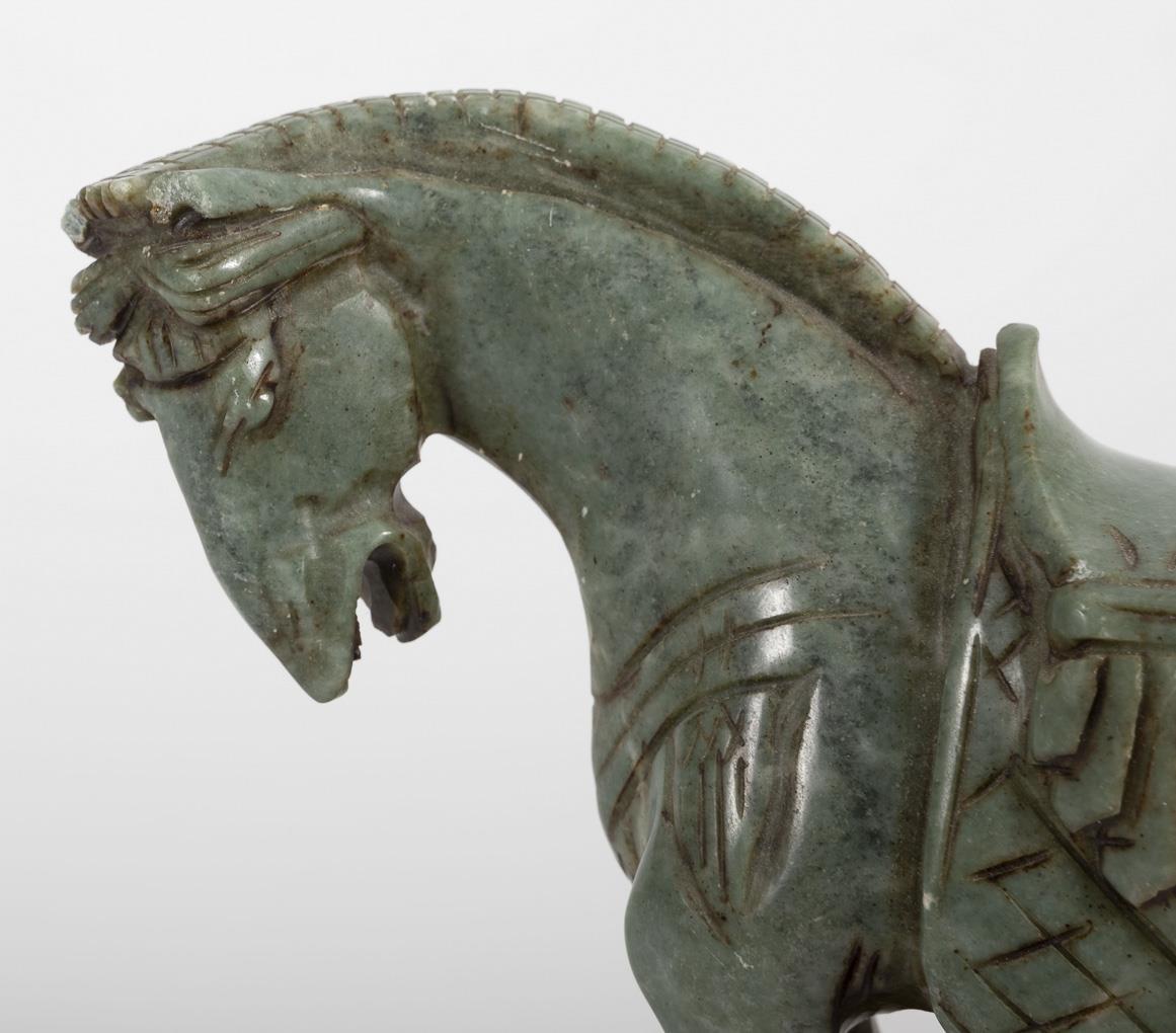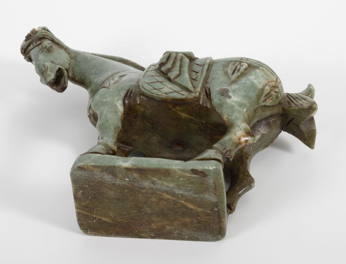 Artfully molded sculpture of a saddled horse on flat base. Ears somewhat bumped.