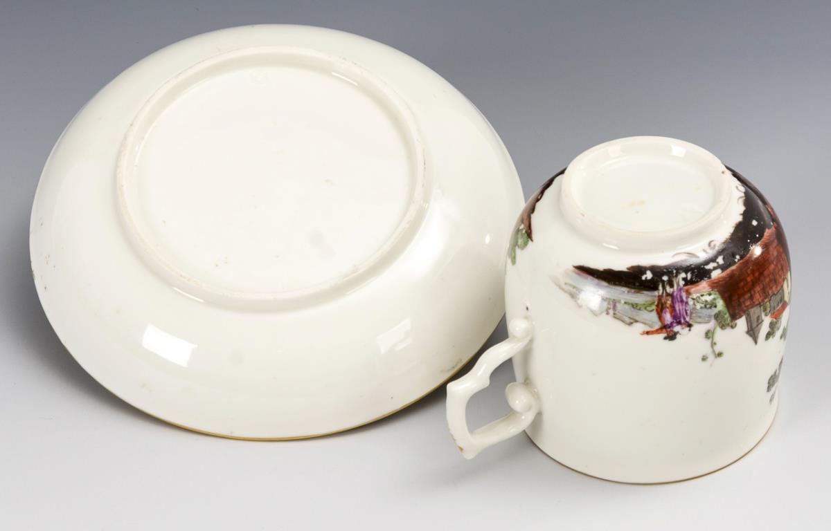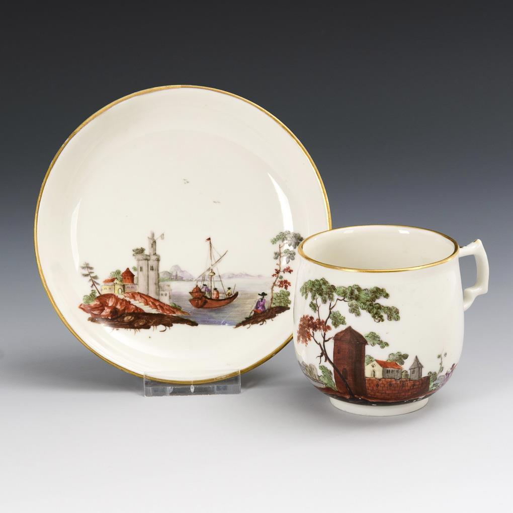 Slightly bulbous cup with angular handle. Depicting a river landscape with architecture and staffage. Paint chipping on the cup.