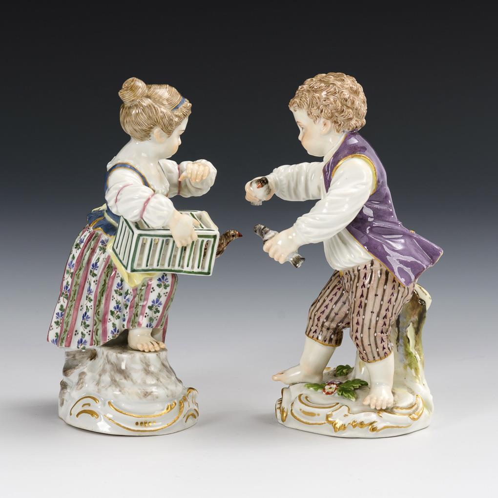 1x girl with birdcage and 1x boy holding two doves in hands. Girl: Dove, birdcage and left hand restored, birdcage door missing; boy: doves restored.