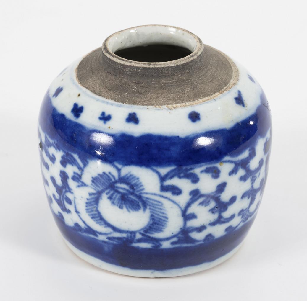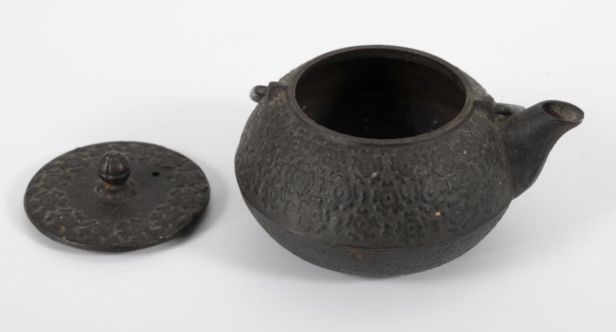 Small iron teapot, marked, with flat flower relief on upper wall. H 12 cm. / Small jar with characters "Double joy" between tendril ornaments. Without lid, h 9 cm.
