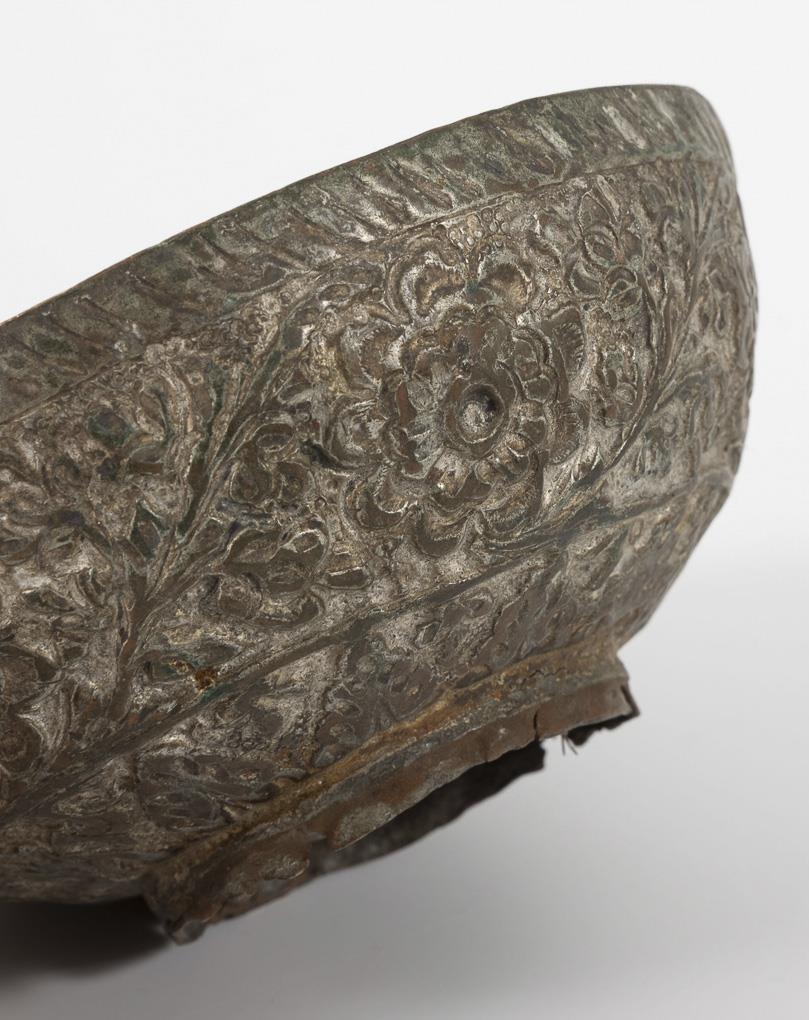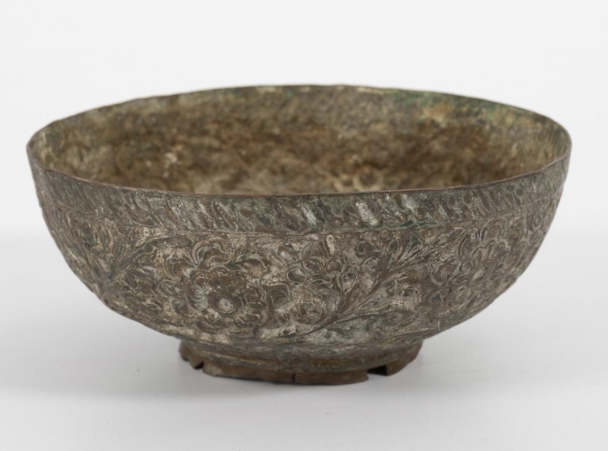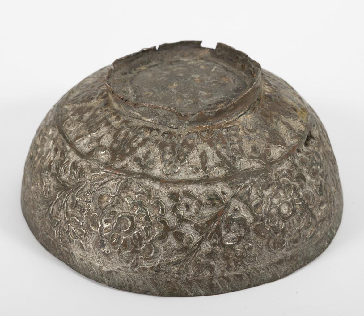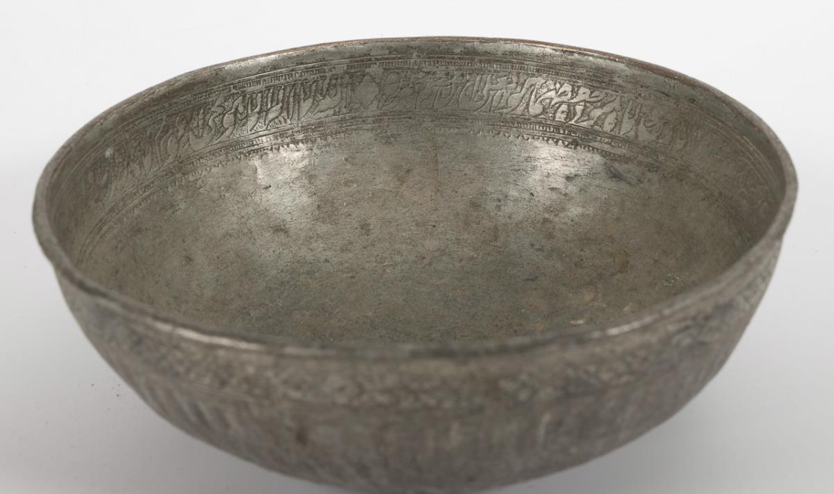 Large bowl with Arabic characters in the rim and a soldered joint. Ø 29,5 cm. / Driven bowl with surrounding Arabic or Hebrew writing in the inner rim. Ø 16 cm. / Small bowl with flat bottom and chased pattern inside and outside. Ø 14,5 cm. / Very nice chased bowl with all-over floral ornament, Ø 13,5 cm. All with stronger signs of age and use.