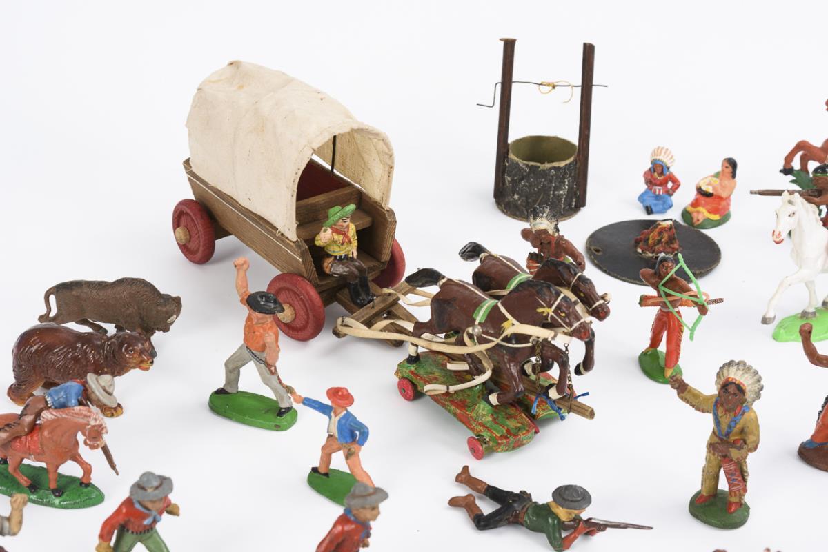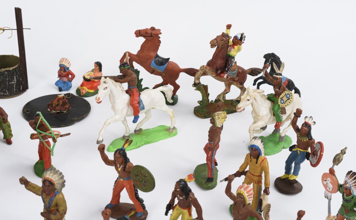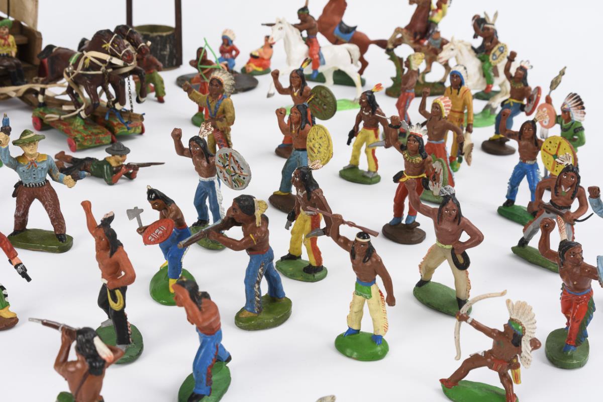 Approx. 54 Indians and cowboys of various manufacturers, including Lisanto, Friedhold Fischer and Emil Bayer. In addition, carriage (11.5 x 30 x 9 cm), well and campfire. Played, small defects.