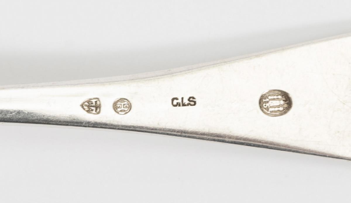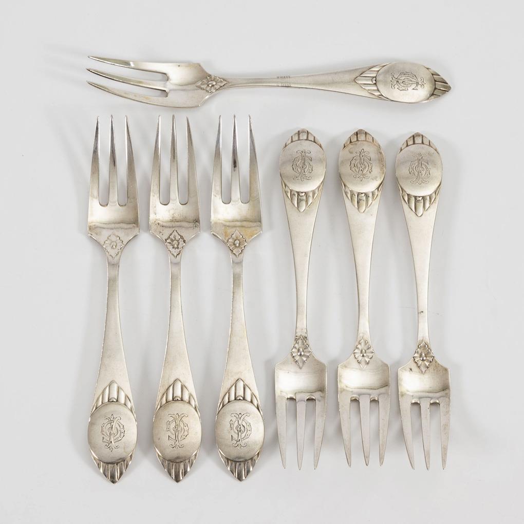 Art Nouveau forks with intertwined monogram engraving on ribbed diamond shape.