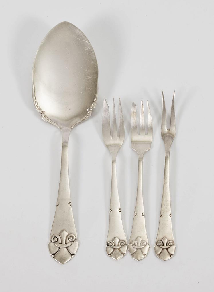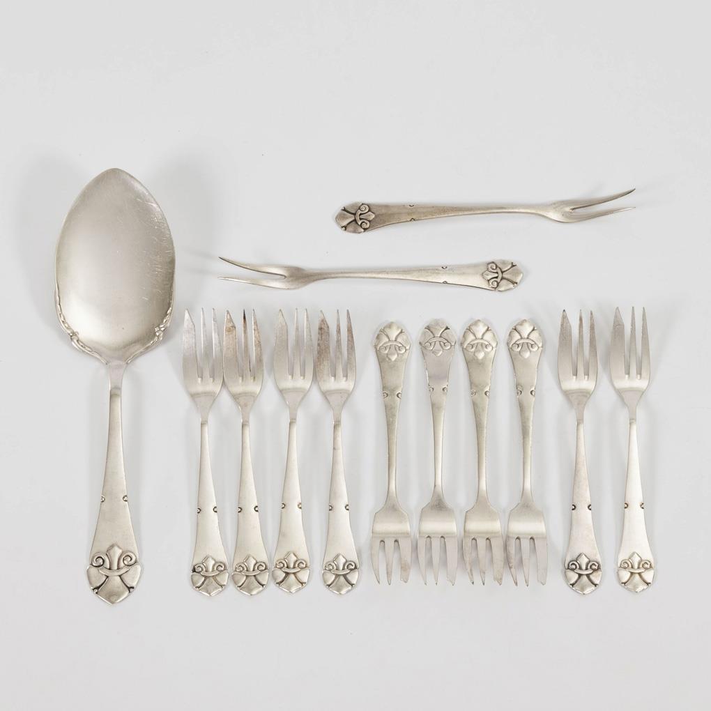 With relief lily motif: 10 cake forks, 1 lifter and 2 serving forks. Scarcely any signs of use.