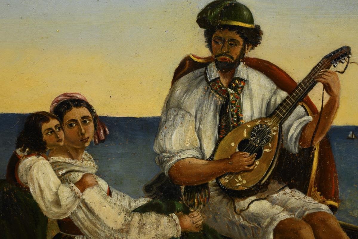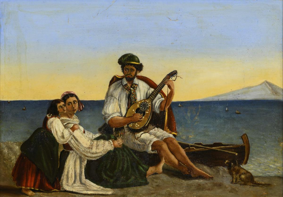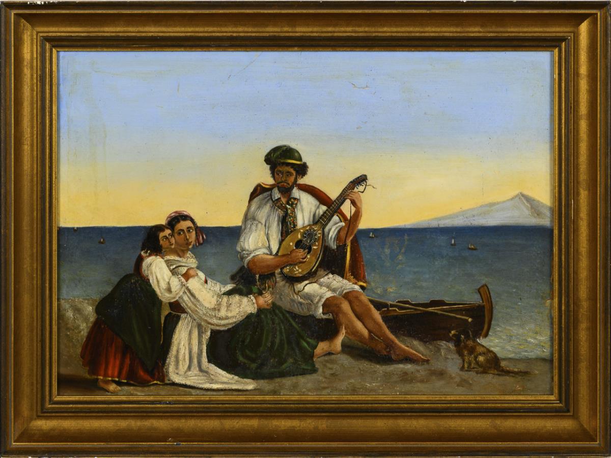 Music-making father with daughter and mother on the beach of the Gulf of Naples. The original hangs today in the Thorvaldsen Museum Copenhagen. Restored.
