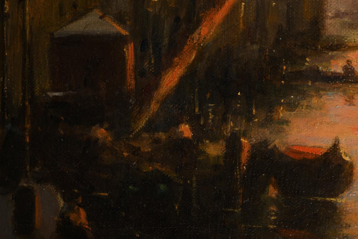Gondoliers on the water with the setting sun at the end of the canal. Retouched in the sky.