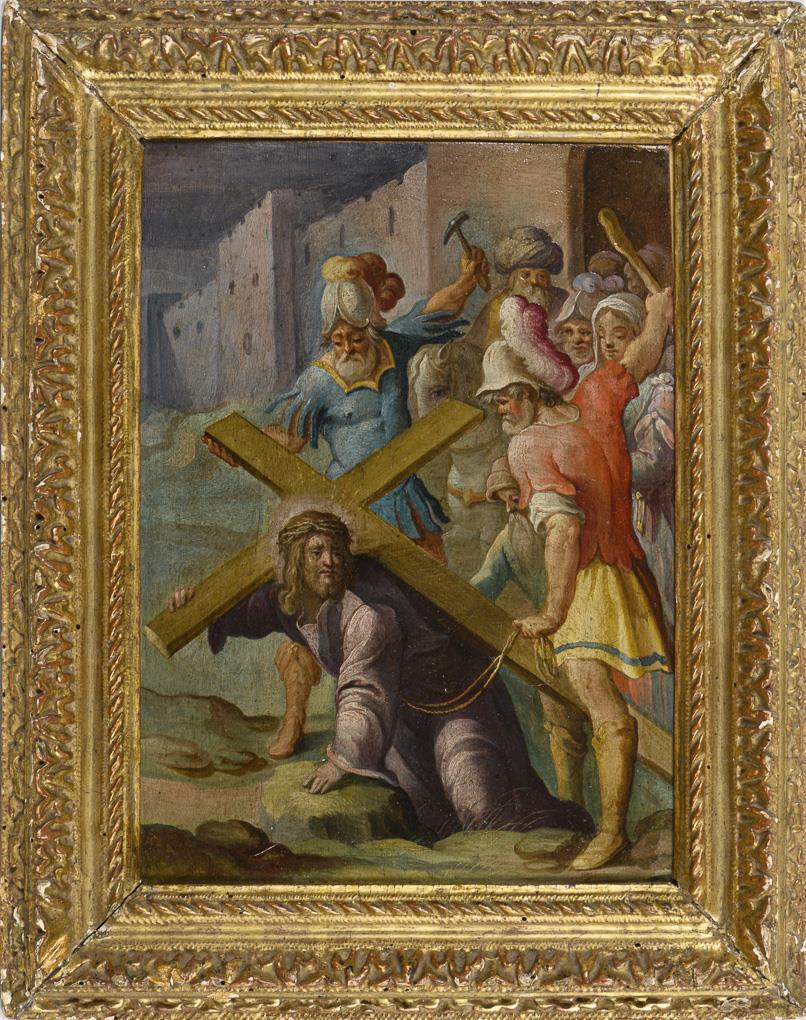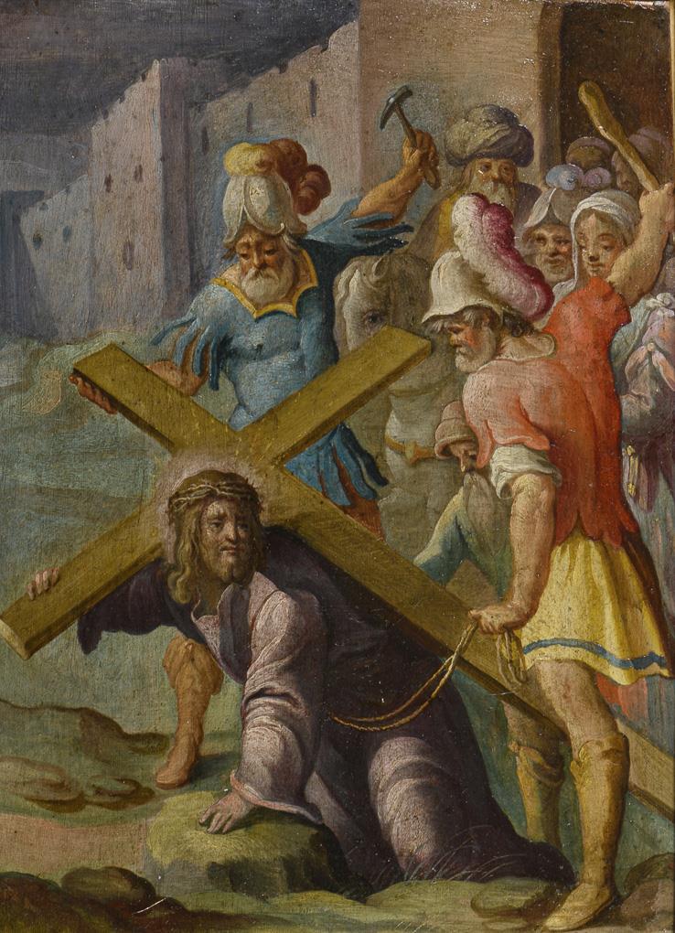 The Messiah with the cross on his shoulders on the way to Mount Golgotha. Behind him the driving executioners and crowds. Slight signs of age.