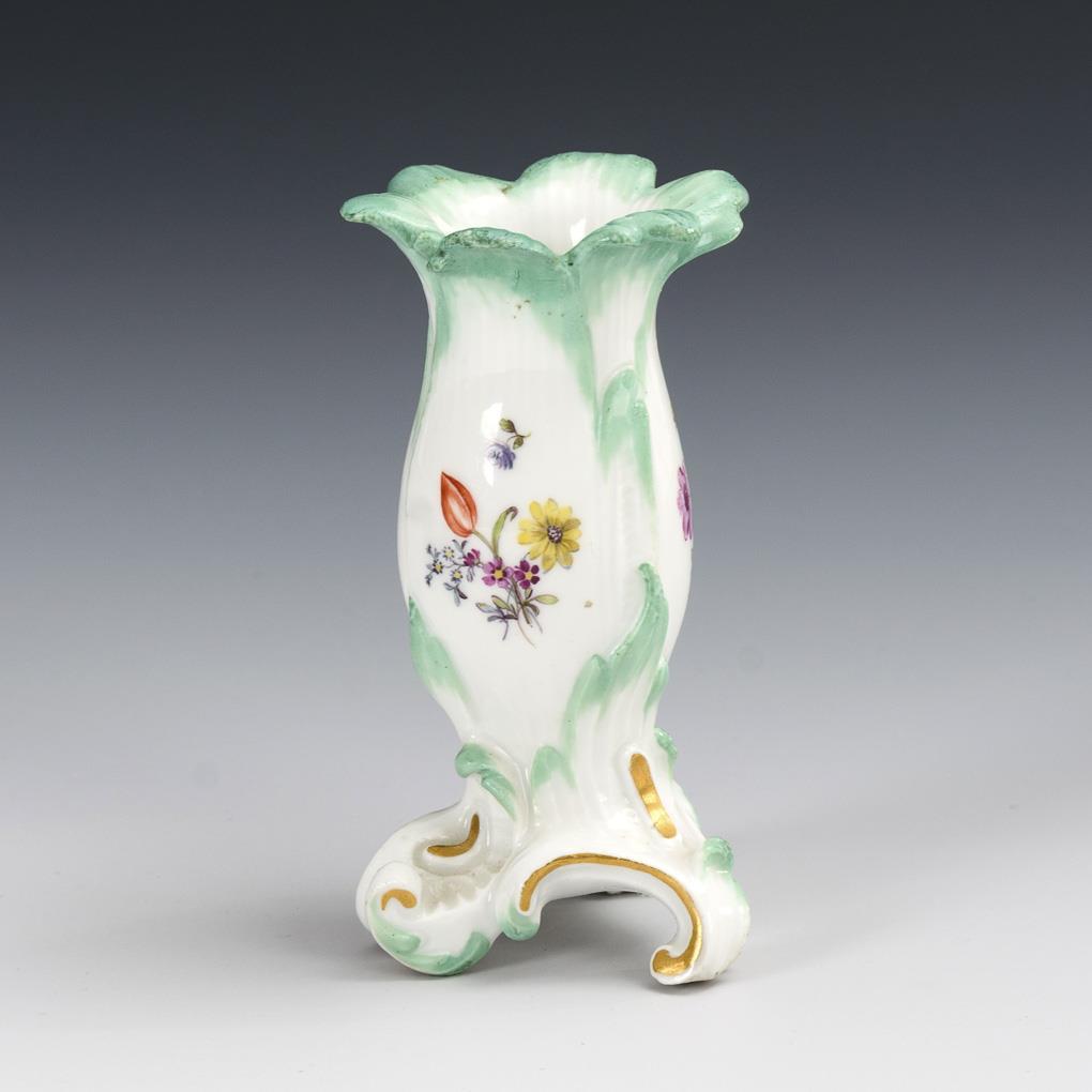 Small vase in flower goblet shape with three rocaille feet, on the wall three small flower bouquets. Rim of the vase restored.