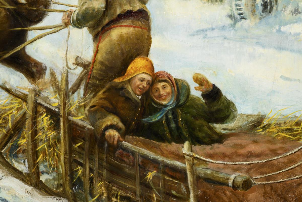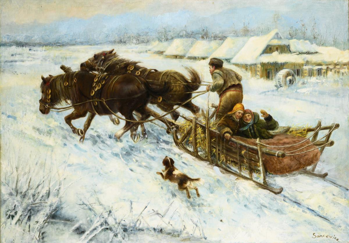 Three people in a sleigh at a fast gallop of horses through the snow near the village.