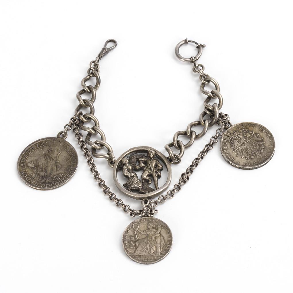 Silver plated main chain, accompanying chain silver tested, coins/medal and relief of silver, partly low alloyed. 28 cm.