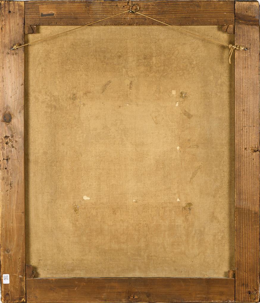 Portrait of a young woman in stately clothes with pearl necklace on St. Mark's Square in Venice with the harbor in the background. Canvas doubled.