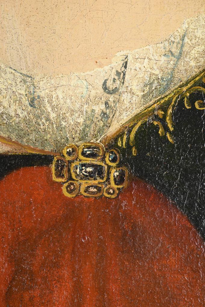 Picture of a man in armor with red frock coat and white wig and portrait of a woman in dark green dress with red coat and white wig with gold and pearl jewelry. Each traces of age.
