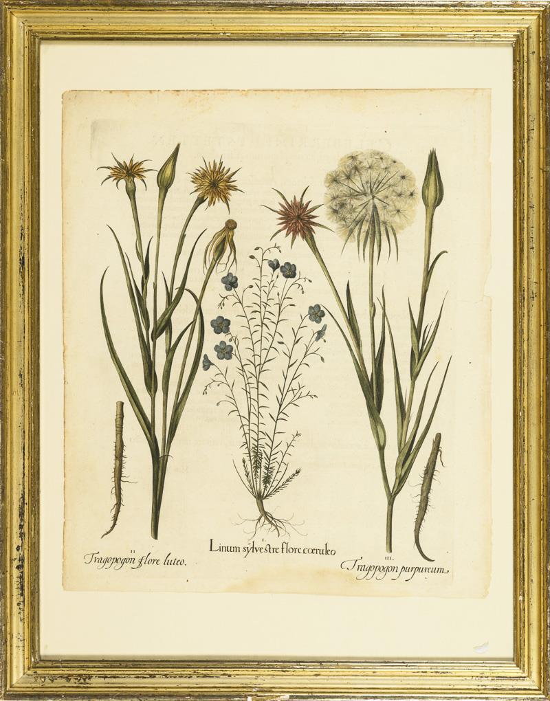 Sheet 161 with precise representations of blue flax "Linum sylvetsre flore coeruleo", meadow goat's beard "Tragopogon flore luteo" and goat's beard "Tragopogon purpureum" from the botanical magnum opus "Hortus Eystettensis" (Eichstätter Garten) with 1100 plants from all over the world, which was published in 1613 for the first time in so-called king size (55 x 47 cm); verso with typographic text in Latin "Celeberrimi Eystetten [....]". Marginal area light browned and foxed, some traces of handling.