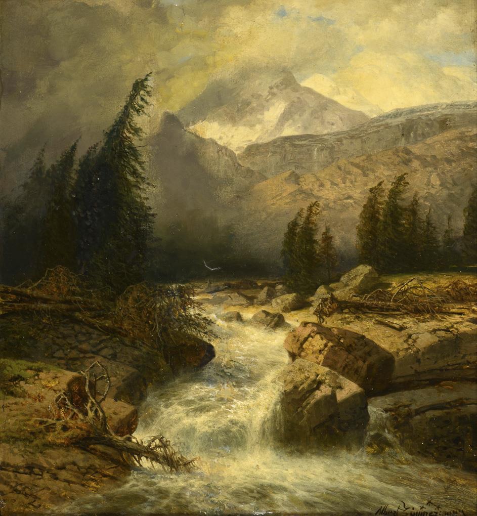 Each depicting a raging mountain river between large rocks, once with mill, each against the peaks in the background. Each retouched.