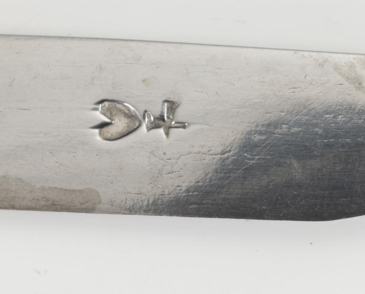 Silver soup spoon and fork with silver handle with similar flower decoration. In addition, knife with slightly different floral decoration on the silver handle. Knife with defect or old repair on the handle.