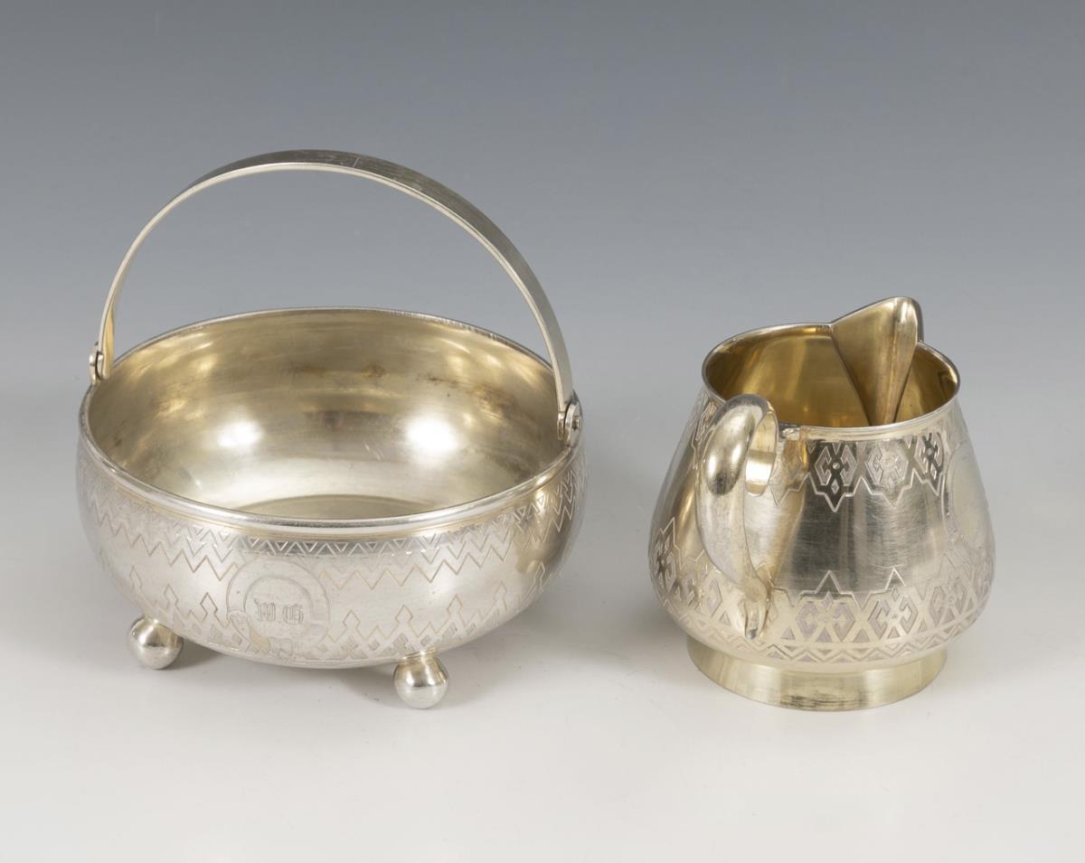 Milk jug and handle bowl with geometric braid engraving and monogram "WG". Sugar bowl dented, 1 foot minimally dented.