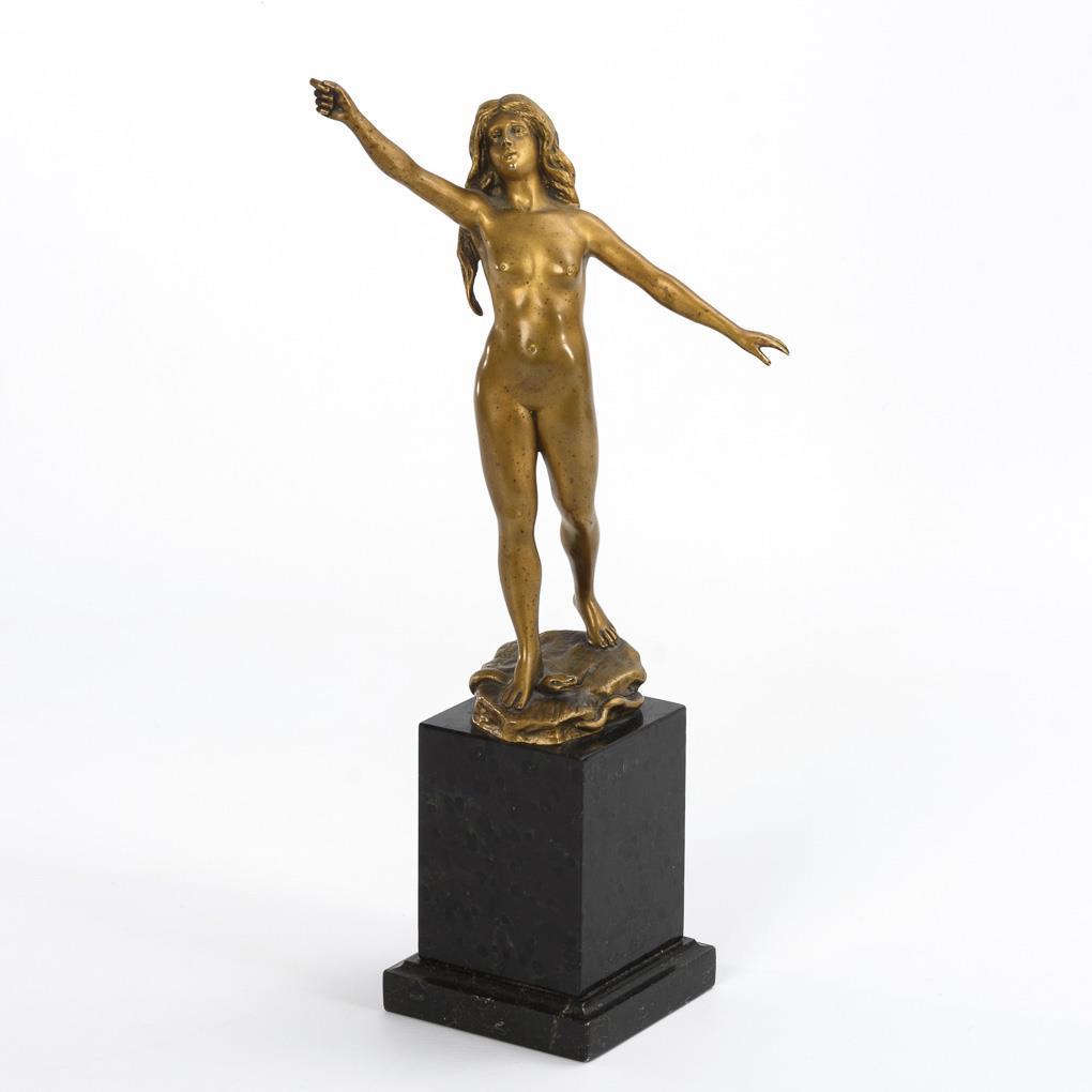 Gold bronze, serpentine base. Inscribed. H 24 / 35 cm.