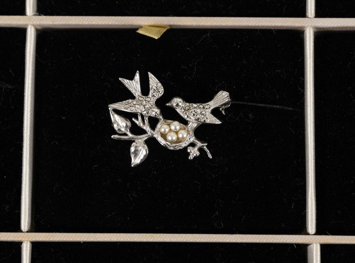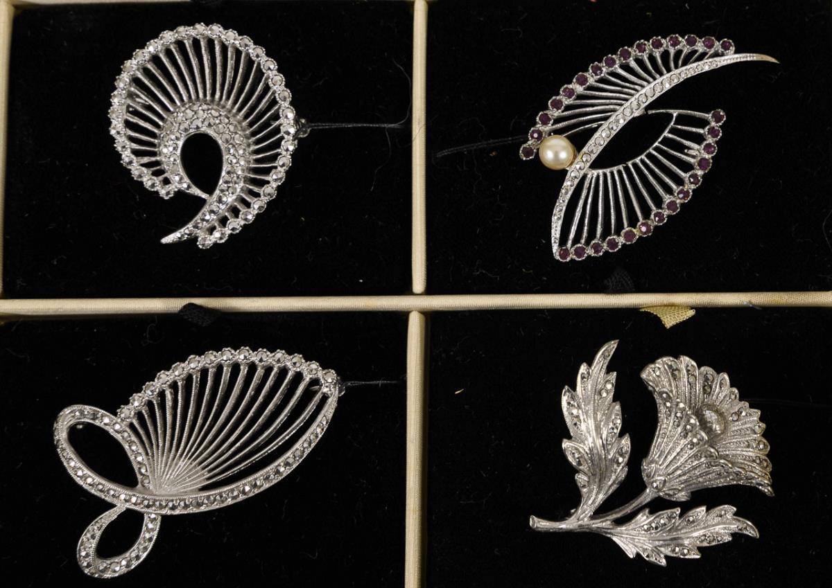 32 costume jewelry brooches with marcasites on representative pallets.