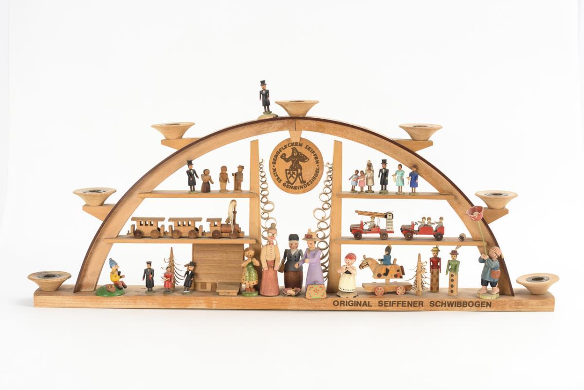 Classic candle arch with 7 candle sleeves, centrally inscribed: "Bergflecken Seiffen. Oldest municipal seal." With various figures, partly wood-colored, partly colored set. Traces of use, small defects, some figures supplemented.