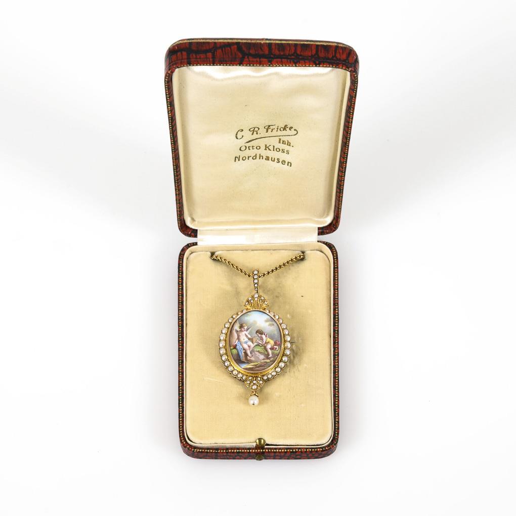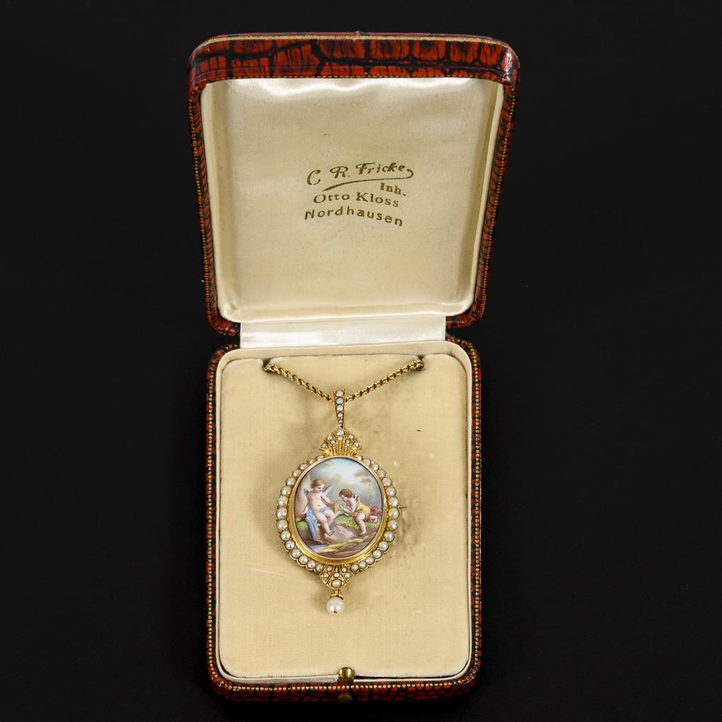 Frame-set miniature with putto motif surrounded by inset seed pearls and pearl suspension. Glazed framed compartment on the back. C hook. Hanging eye. Ornamental armor chain with beaded eyelet and case clasp. Reddish brown case .