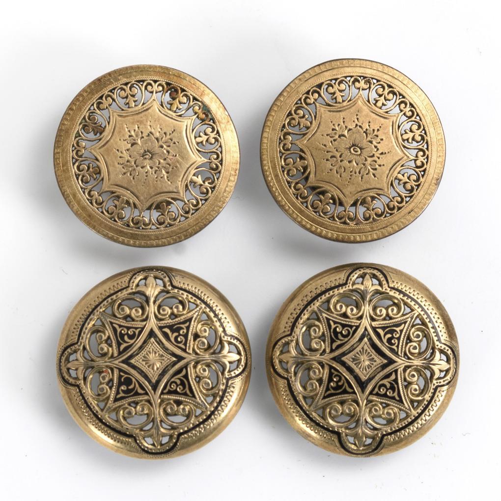Metal probably gilded, 1 pair with niello. Ø 2,3 cm.