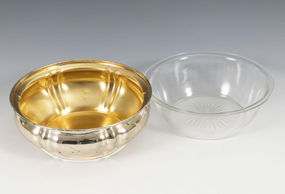 Godronized bowl, gilded inside. Probably original glass insert with bottom star. Scratches, 2 small dents. Glass with small edge chips.