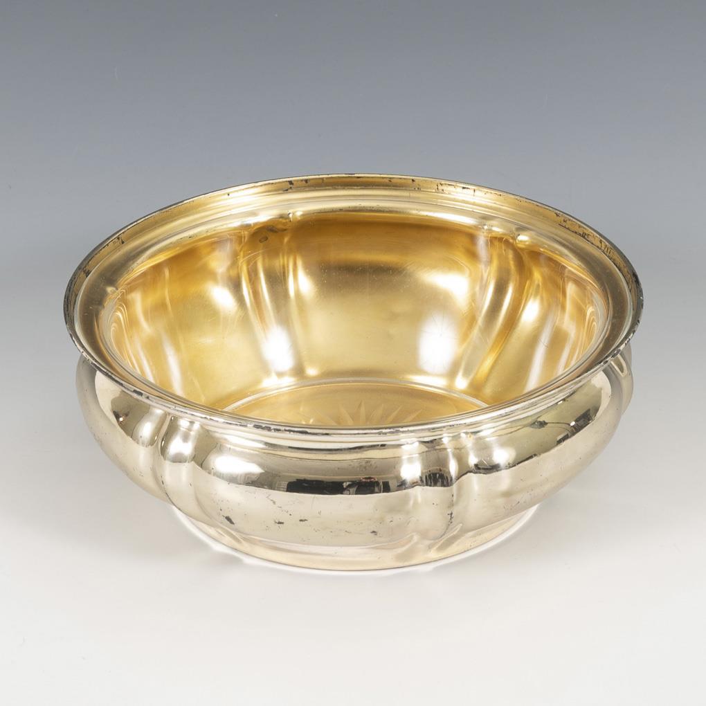 Godronized bowl, gilded inside. Probably original glass insert with bottom star. Scratches, 2 small dents. Glass with small edge chips.