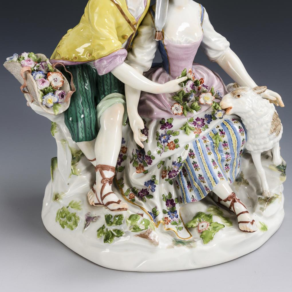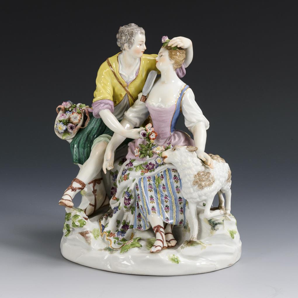 Sitting, kissing young rococo couple with flower-filled hat and sheep. Staff defective, bumps on flowers and leaves, right foot and right hand of the lady.