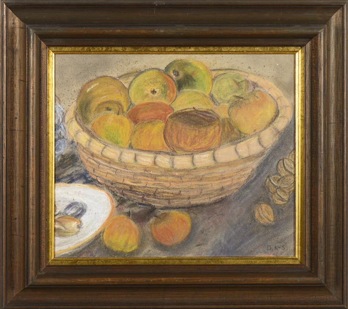 Still life reminiscent of Dora Koch-Stetter with apples in a basket next to walnuts and a plate with other fruits.