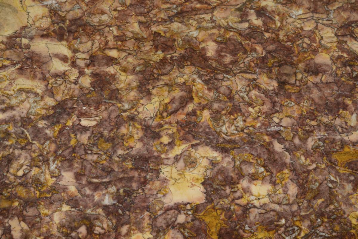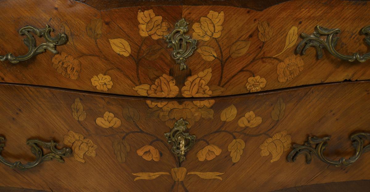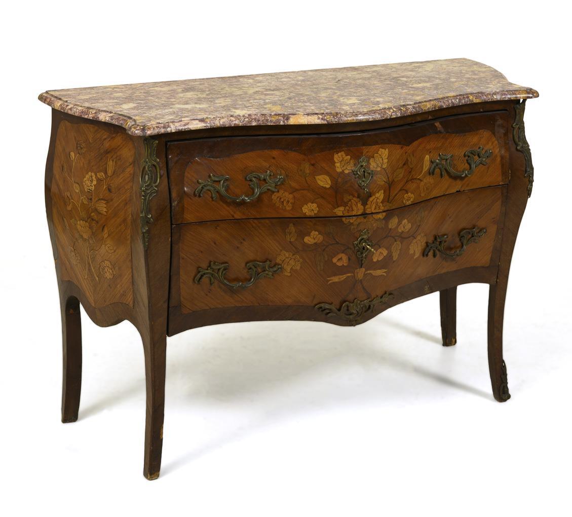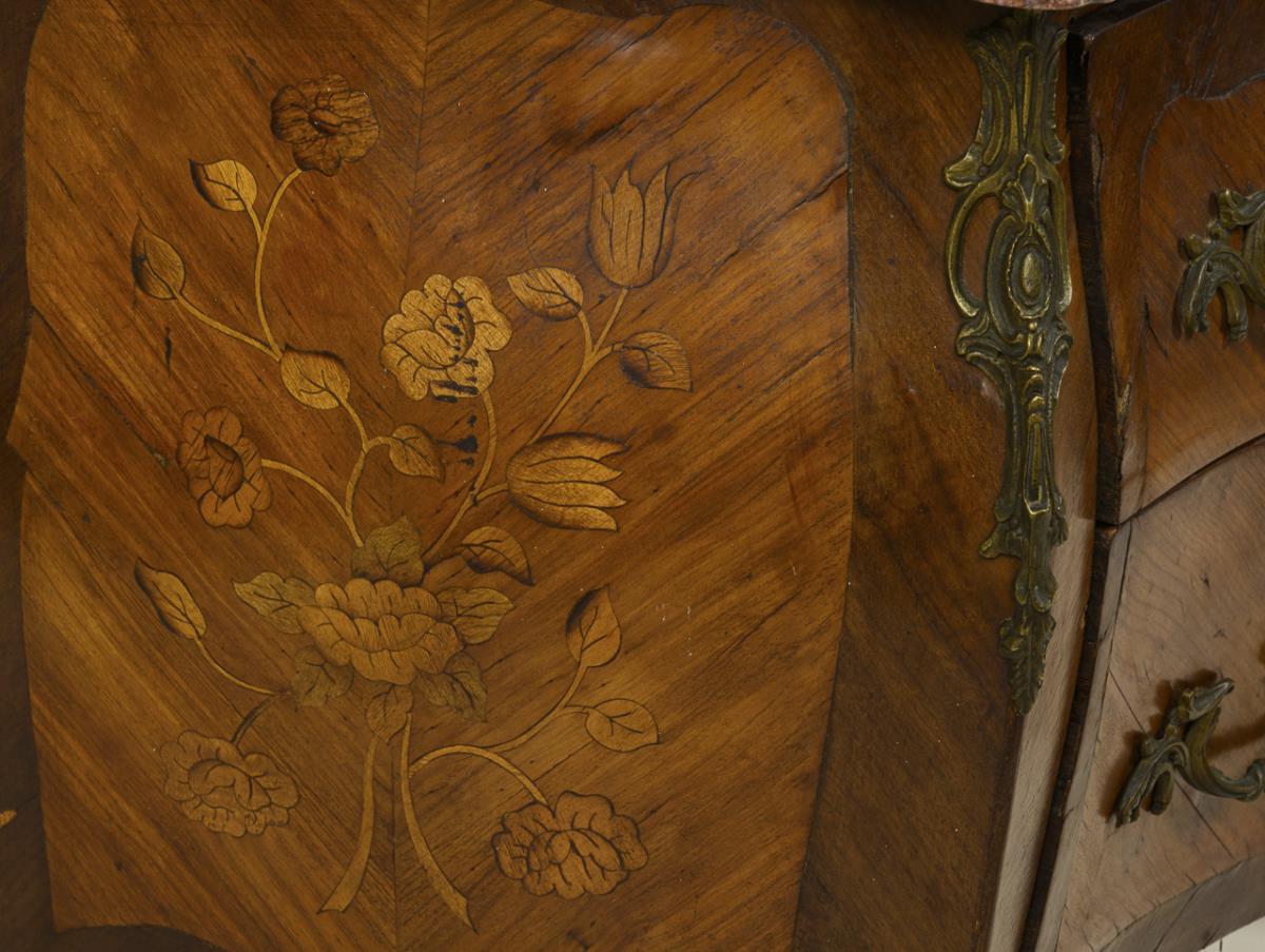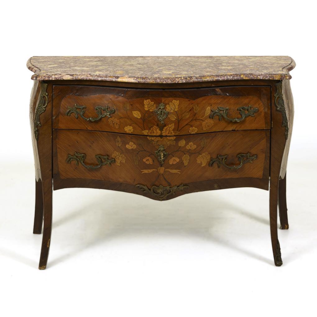 2-slab, style-typical curved chest of drawers with exceptional rose, orange and purple marble top, decorated with lush bronze applications and floral marquetry. Light signs of age/use, veneer with dry cracks and small defects.