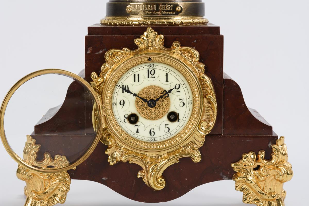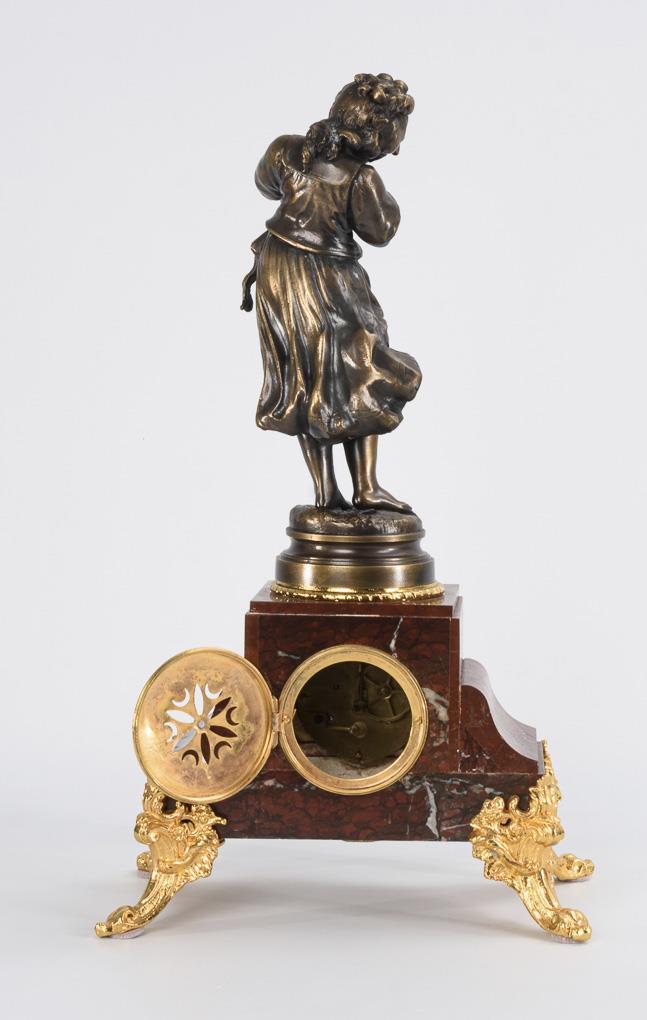 Elegant case crowned by a girl with a dove (The Beloved Bird). Probably made after the model of the French sculptor Auguste Moreau (1834-1917). Use old and new parts.