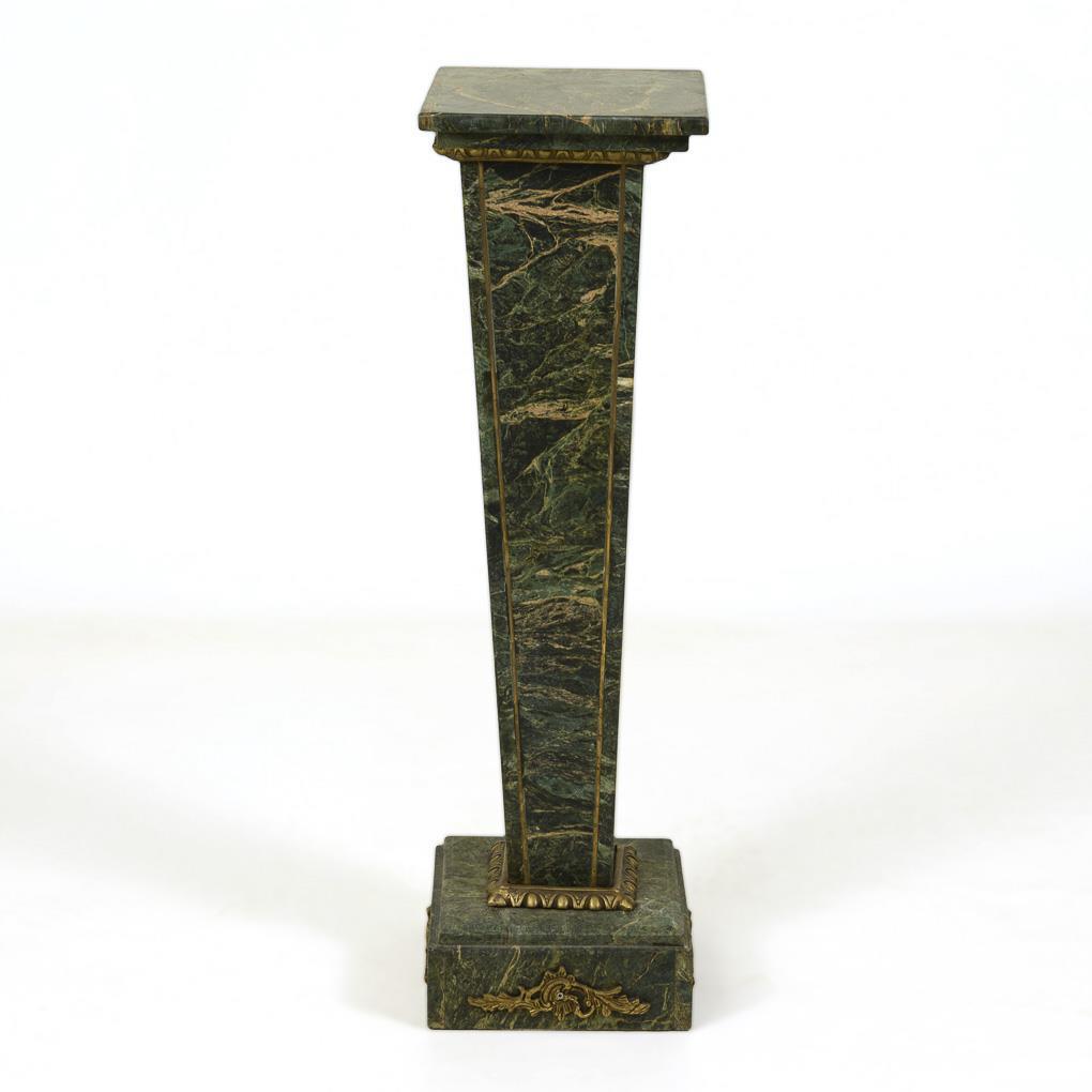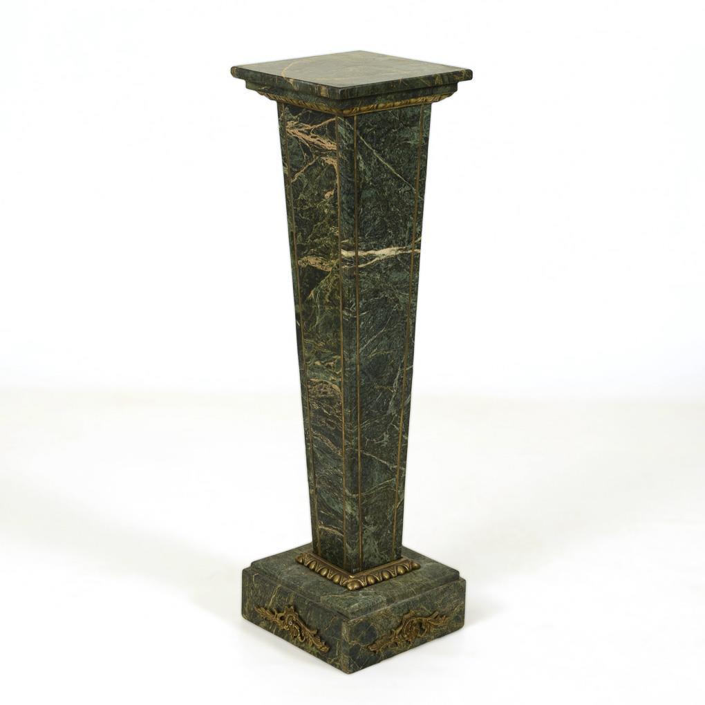 Classical-style flower column of dark green, gray-veined marble on tapering pillar with plinth and square top; decorated with antiquing and rocaille bronze applications. Signs of age/use, one corner of the top bumped.