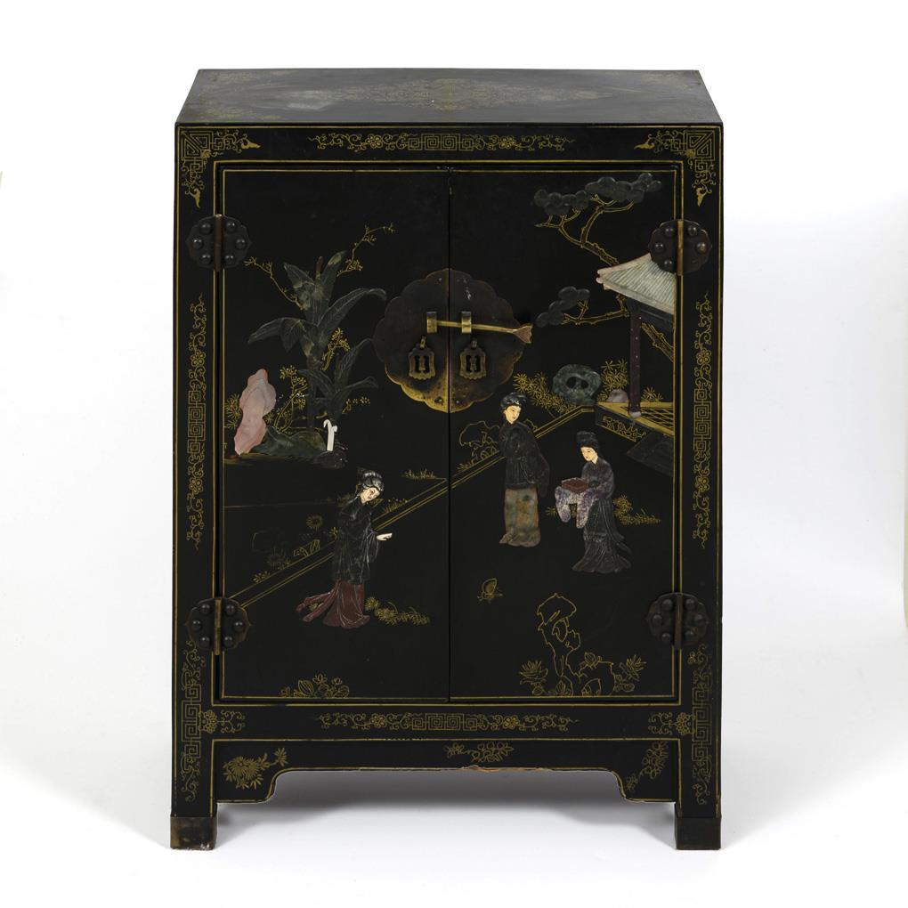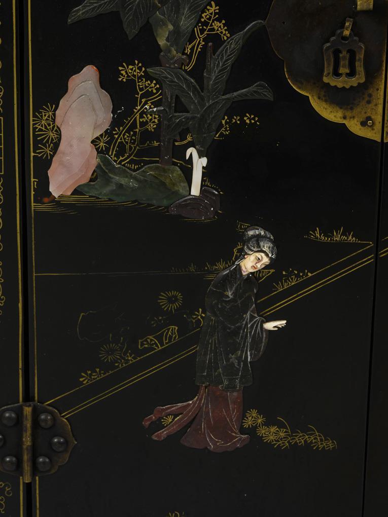 Two-door lacquer cabinet with relief stone inlays.
