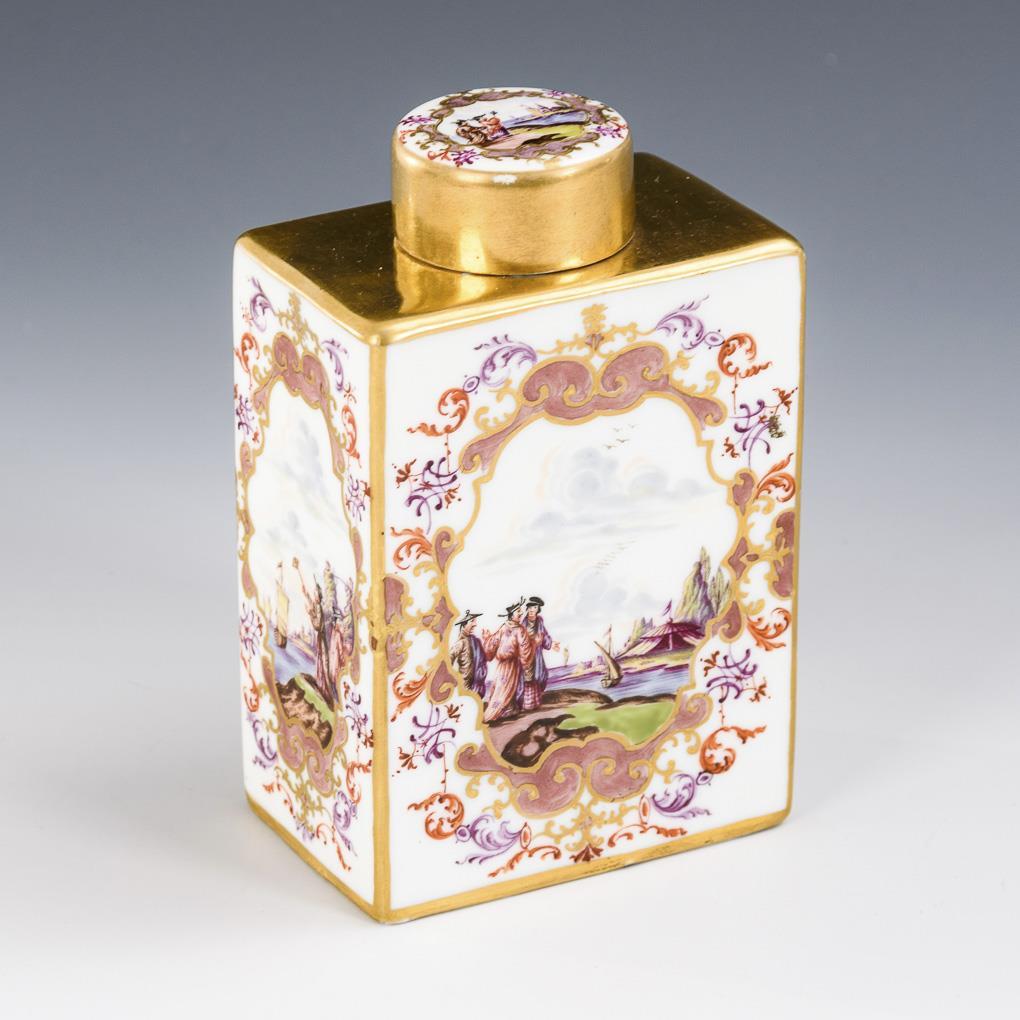 Rectangular box, on all sides on the body as well as on the lid a cartouche depicting a landscape with Chinese. Minimal gold rubbing on the rim of the mouth.