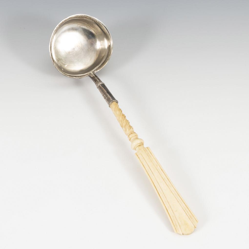 Simple ladle with twisted handle and fan-shaped handle end. Laff dented and soldered.