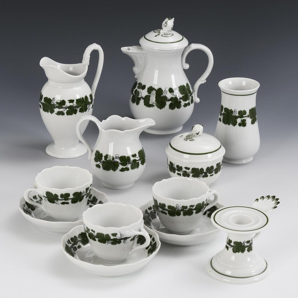 Form "New Cutout". Mocha pot (h 16.5 cm), 2 milk jugs (h 9.5 and 15 cm), sugar bowl, 3 demitasse cups with 3 saucers, vase and candlestick. Sugar bowl knob bumped.