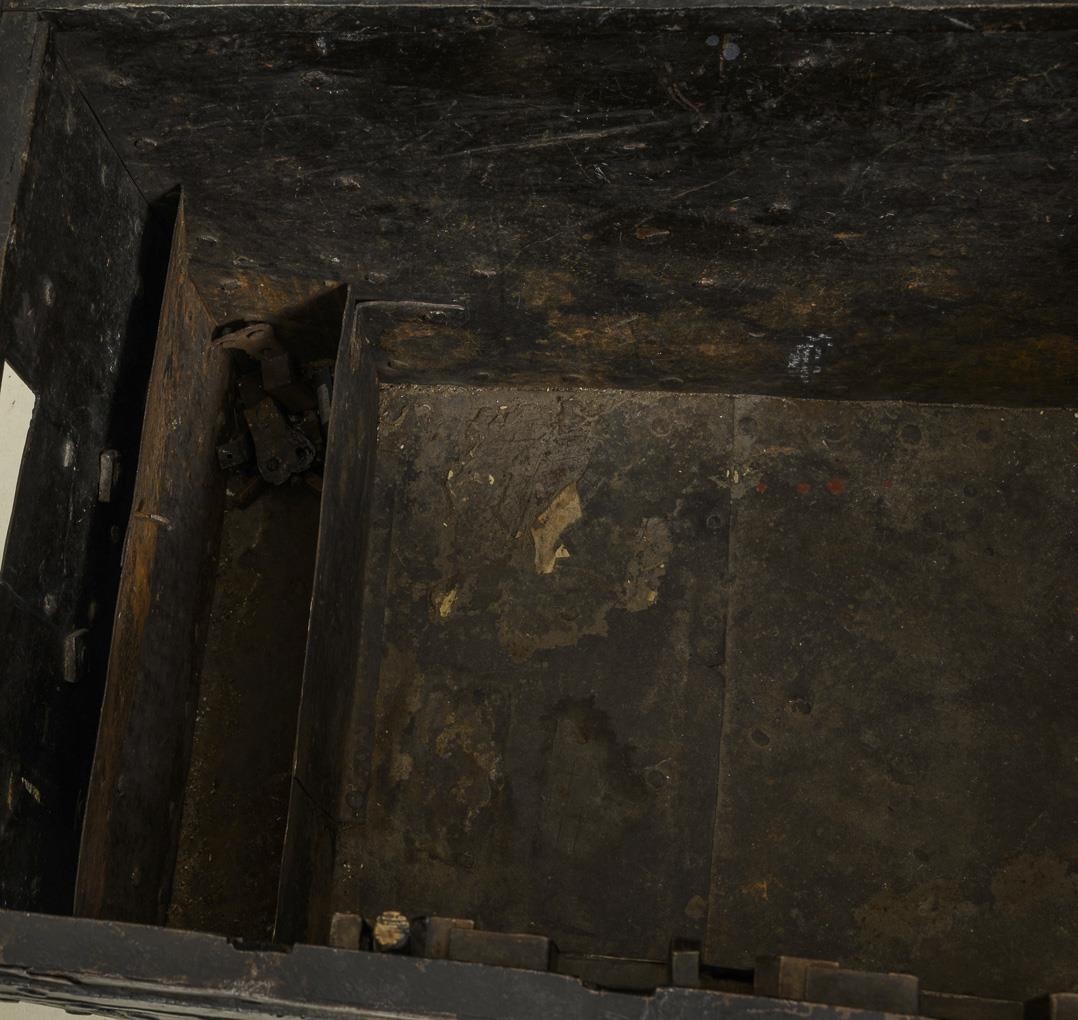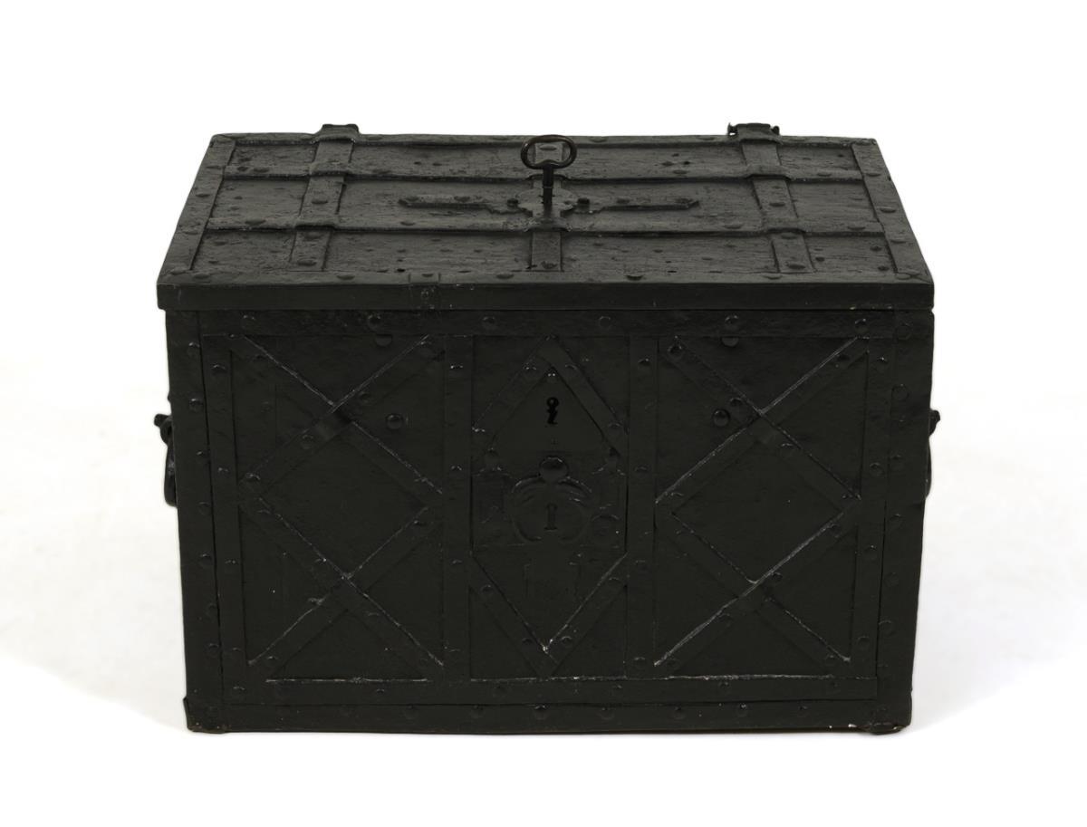 Very heavy iron chest with riveted bands on all sides and on the lid. Front side 1 mock keyhole with decoration and 1 keyhole above. Hinged carrying handles on the sides. Hinged lid with central keyhole. Open lock mechanism in lid with 12 firing tumblers (8 latches + 4 deadbolts) and originally 2 fixed tumblers. Additional front lock with 3 firing latches. Inside hatchet without lock as well as lid retaining rod. 1 side panel with cutout (7 x 11 cm), 1 lid hinge pin and upper front keyhole aperture supplemented, key front lock missing, key lid lock with defective beard (thus does not close, locks blocked with woods), lock chapel supplemented (egg light preserved), 2 fixed tumblers and 1 stud loose enclosed as well as 3 shooting latches (these from another lock?), signs of age / use.