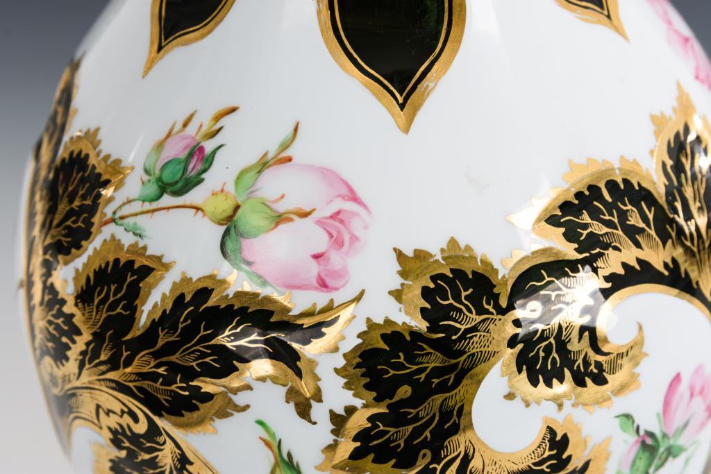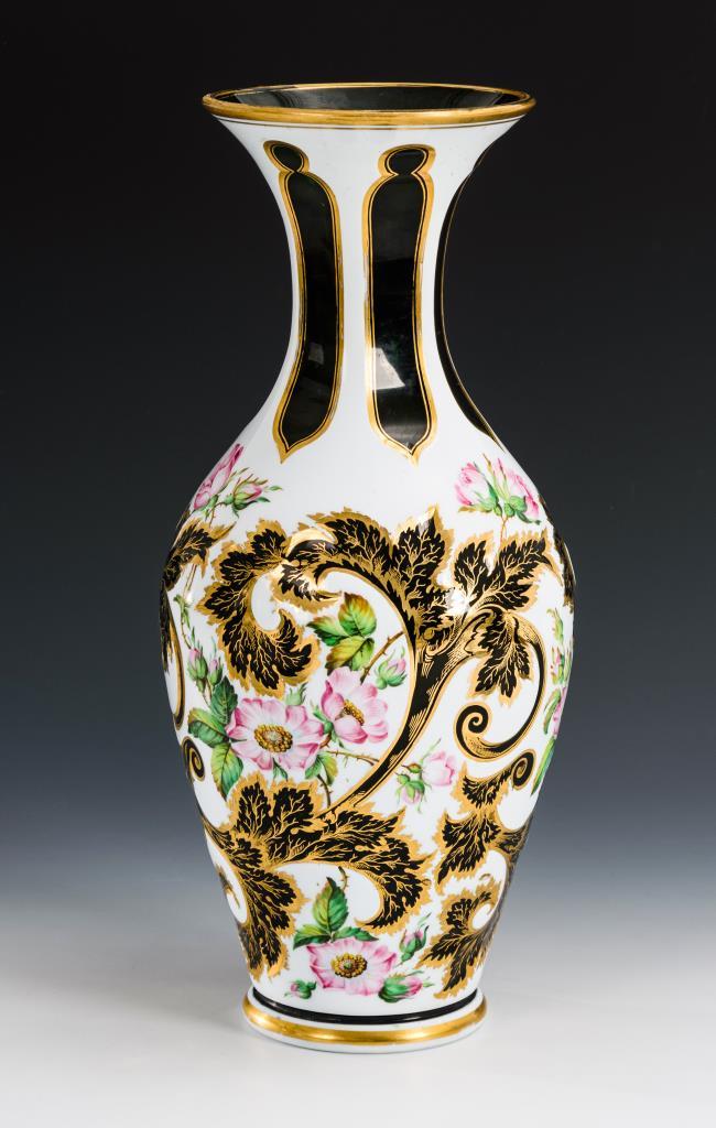 Um 1840/50. Dunkelgrünes, weiß überfangenes Glas. Balustervase mit ausgeschliffenen, rankenden Blättern sowie farbig gemalten Rosenzweigen, goldstaffiert, ausgekugelter Abriss. Gold etwas berieben. H 36 cm.