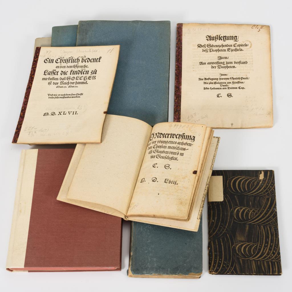 "Beschluss vnnds, Valete. Auff Flaccij Jllyrici letste zwai, schmachbüchlen, antwurt vnd gruntliche verlegung genannt. Und Das Caspar Schwenckfeld kain Donatist sey. Mit erklerung der fürnembsten spennigen sprüche vom Apostolischen dienst vnd Lehrampt des Euangelij Christi.", 1555, Titelblatt, (5), 136, (1) Seiten. Nur Block im Schutzumschlag. / "Außlegung des Euangelij Luce. 6| Am vierdten Sontag nach Trinitatis. Von den wercken der Liebe vnd Barmhertzigkeit. (Hrsg. v. Daniel Sudermann). 1586, Titel, 19 Blatt. / "Außlegung des Euangelij Luce 15. Am dritten Sontage nach Trinitatis| Vom verlornen schaafe Vnd Von der Bůsse bekeerung vnd widerbringung des sünders durch Christum". (Hrsg.v. Daniel Sudermann). 1596. Titel, 18 Blatt. / "Ein Christlich bedencken von dem Spruche. Lasset die kindlen zů mir kum̃en dañ SOLCHER ist das Reich der himmel. Matt.19, Mar.10. Vnd wie er nach dem sinn Christi recht solle verstanden werden." (Ulm: Hans Varnier d.J.) 1547. Titel, (11) Blatt. / "Außlegung Desz Sibentzehenden Capitels desz Propheten Ezechiels. Jtem| Ain anweisung zum verstand der Propheten. Item Ain Außlegung zwayer Sprüch Pauli Als zun Galatern am Fünfften Unnd Zun Hebreern am Dritten Cap." ([Ulm: Hans Varnier 1552). Titel, 29 Seiten. / "Vndterweysung von der vbung eines anhebenden Christen menschens im̃ Glauben vnnd in der Gottseligkeit". (Augsburg : Gegler, Hans) 1558. Titel, (14) Blatt. / " ... Lehr auß seinen eigenen Schrifften trewlich verfaßt vnd widerlegt durch die Articul vnsers Christlichen Glaubens. Sampt einem kurtzen vorgesetzten vnderricht von der wahren erkantnuß Gottes vnd wie sich einer darinnen vnder so vil Secten vnd Spaltungen Resoluiren soll. Durch Danielem Tossanum Diener des Worts Gottes. ...". Getruckt in der Churfürstlichen Statt Heidelberg durch Johannem Maier, 1575. Titel, 17, 160 Seiten. Beigebunden: "Zehen fürneme Jrthum Caspar Schwenckfelds kürtzlich vnd gründtlich auß hailiger Götlicher Schrifft widerlegt durch M. Georgium Meckhart Diener der Euangelischen Kirchen zu Augspurg bey Sant Vlrich. 1. Corinth ...". Getruckt zů Laugingen durch Philipp Ulhart, 1575. Titel, (58) Blatt. / "Historische Nachricht Von dem Vor zweyhundert Jahren berühmten und verruffenen Schlesischen Edelmann, herrn Caspar Schwenkfeld von Oßing , Samt beygefügter Anzahl seiner Schrifften". Prentzlau gedruckt bey Christian Ragorczy, 1744. Titel, (6), 200 Seiten. / "Kurtze Lebens-Beschreibung Des hoch- von Gott begnadeten und gelehrten Mannes ... Nebst dessen Abschied so den 10. Decembris des 1562sten Jahres Christlich und seelig abgeschieden ...". 1697. Porträtkupfer, Titel, (33) Seiten. Alle mit jüngeren oder Interimseinbänden versehen, meist Broschur. Teils mit handschriftlichen Vermerken oder Unterstreichungen . Altersgemäß guter Zustand.