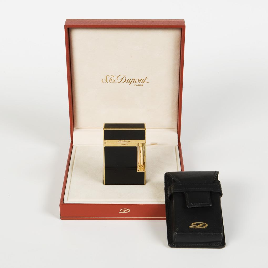 S.T. Dupont Paris, Made in France. Ligne 2, Laque de Chine in black, gold plated case. Reference no. 1I2EC98. Certificate label with no. 36686x, service booklet, Dupont box not quite fitting. Comes with 7 Dupont fire starters, 3 Dupont gas ampoules. Functional, slight signs of use, small notch at the bottom.