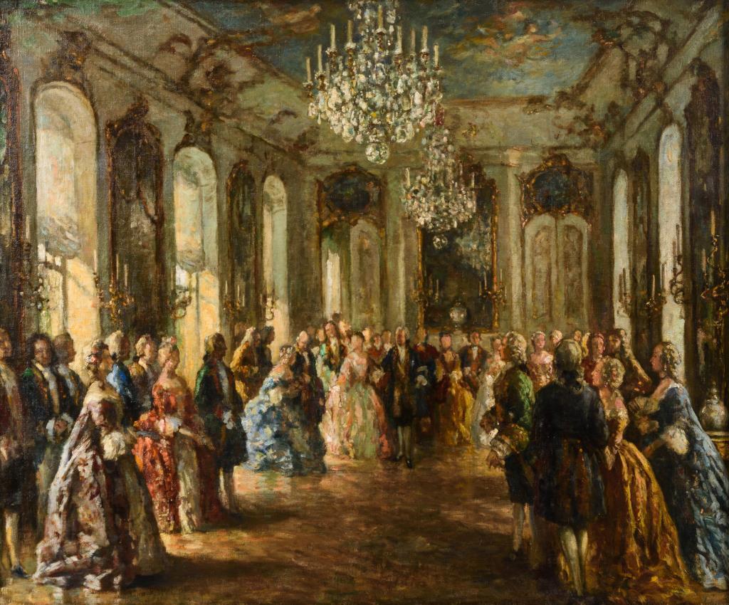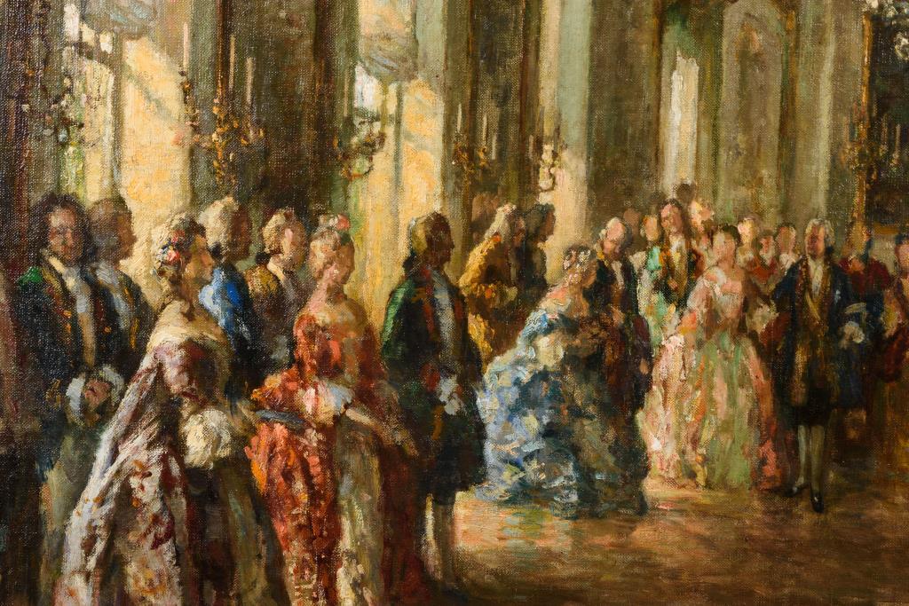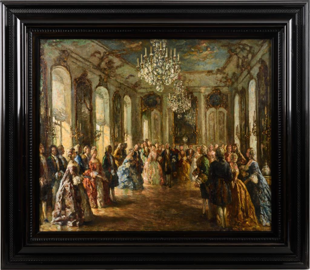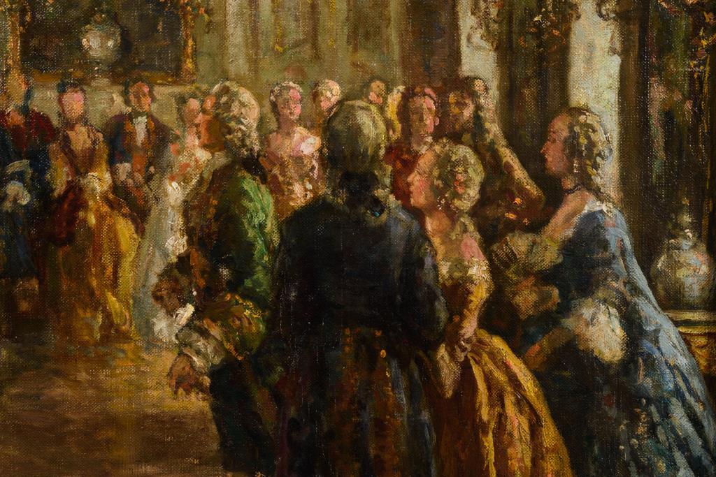 Wohl im Raum Potsdam angesiedelte Ballgesellschaft in der Kleidung des 18. Jahrhunderts, in herrschaftlichen Räumen. Leichte Altersspuren.