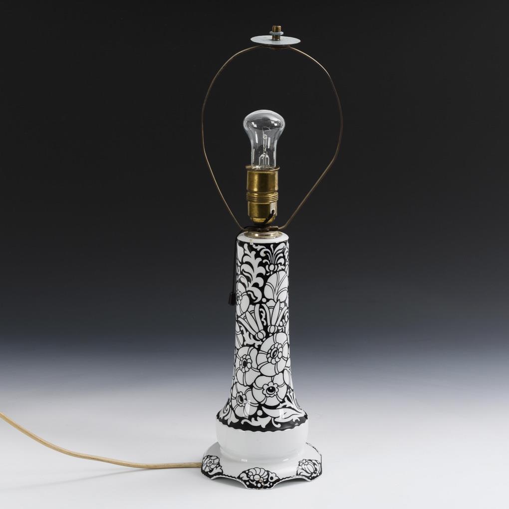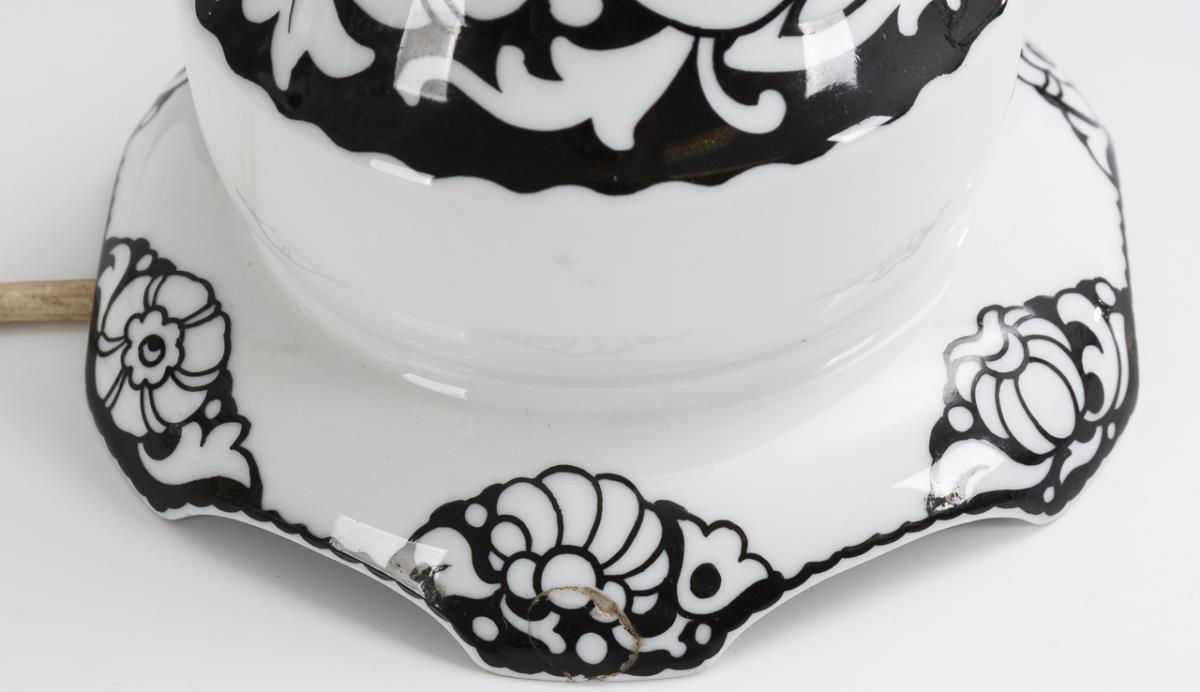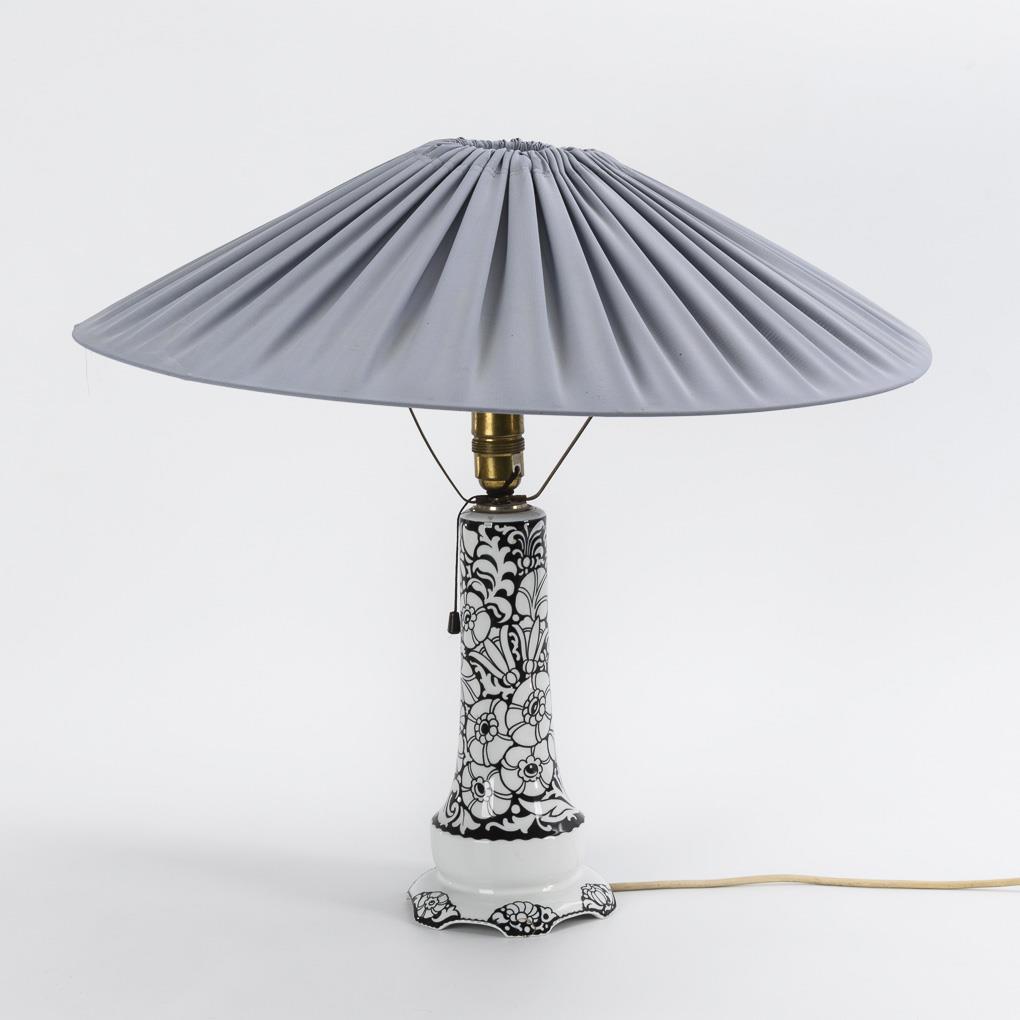 Tapered stem with flared base and six-pass foot. With a surrounding floral decoration in black. Light blue fabric shade. Electrified (function not tested). Glued chip on the stand.