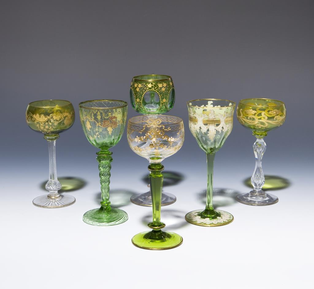 Farbloses und grünes Glas, optisch geblasen oder facettiert. Florale und ornamentale Goldbemalung, partiell mit Schliff- und Schnittdekor. Reliefgold, Goldstaffage. Ein Glas mit weißem Emaildekor. Ein geschliffener Bodenstern.H 17 - 20,5 cm.