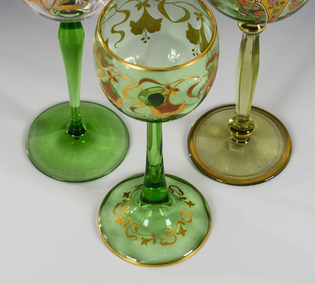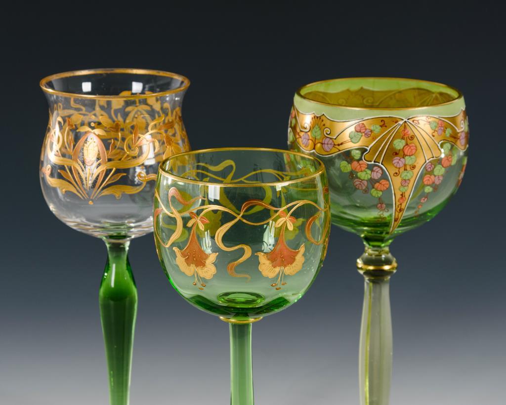 Farbloses und grünes Glas, stilisierte florale Goldbemalung, Reliefgold. Eine Kuppa mit Goldfond und farbigem Emaildekor. Ein Schaft facettiert geschliffen. Ein Fuß berieben.