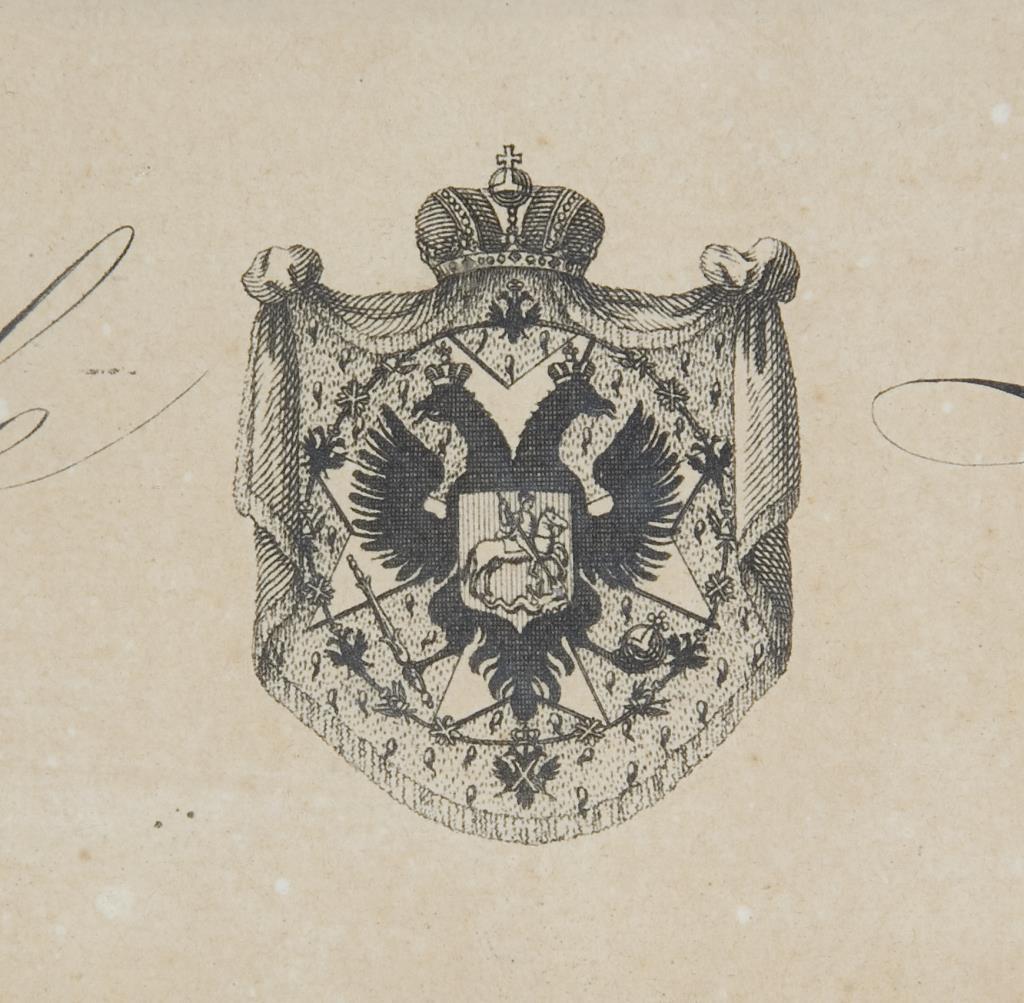 Titel mit Widmung an Zar Paul I. (1754 - 1801 St. Petersburg, ab 1796 Kaiser von Russland). Verglaster originaler Biedermeier-Rahmen mit appliziertem Zaren-Adler. Holzrückwand nummeriert: 1398. Dabei Collane mit Zaren-Adler, kyrillisch bezeichnet, datiert: 20. November 1864, rückseitig mit der gleichen Rahmen-Nr. nummeriert: 1398. Ein Furnierstück an der oberen Rahmenkante fehlt.