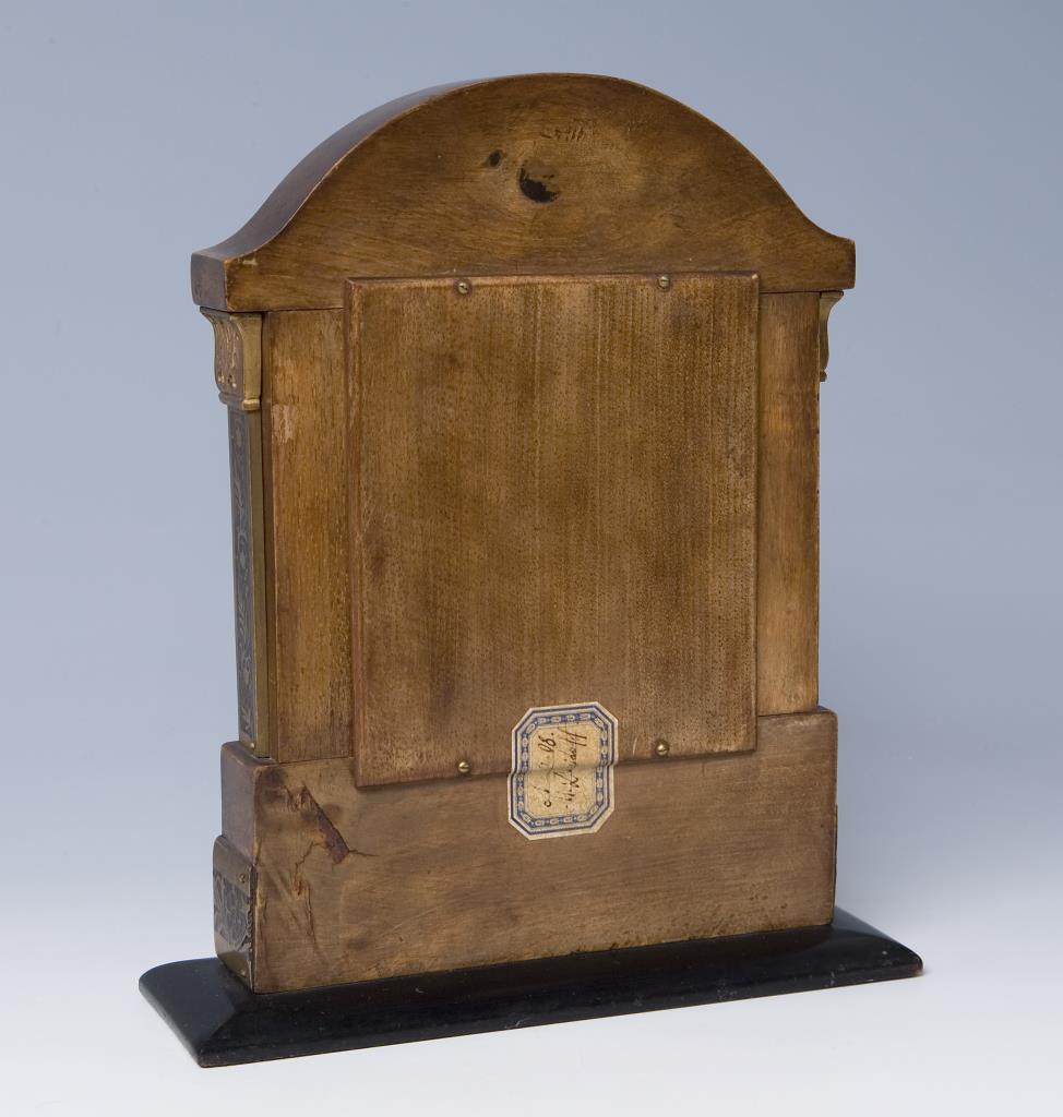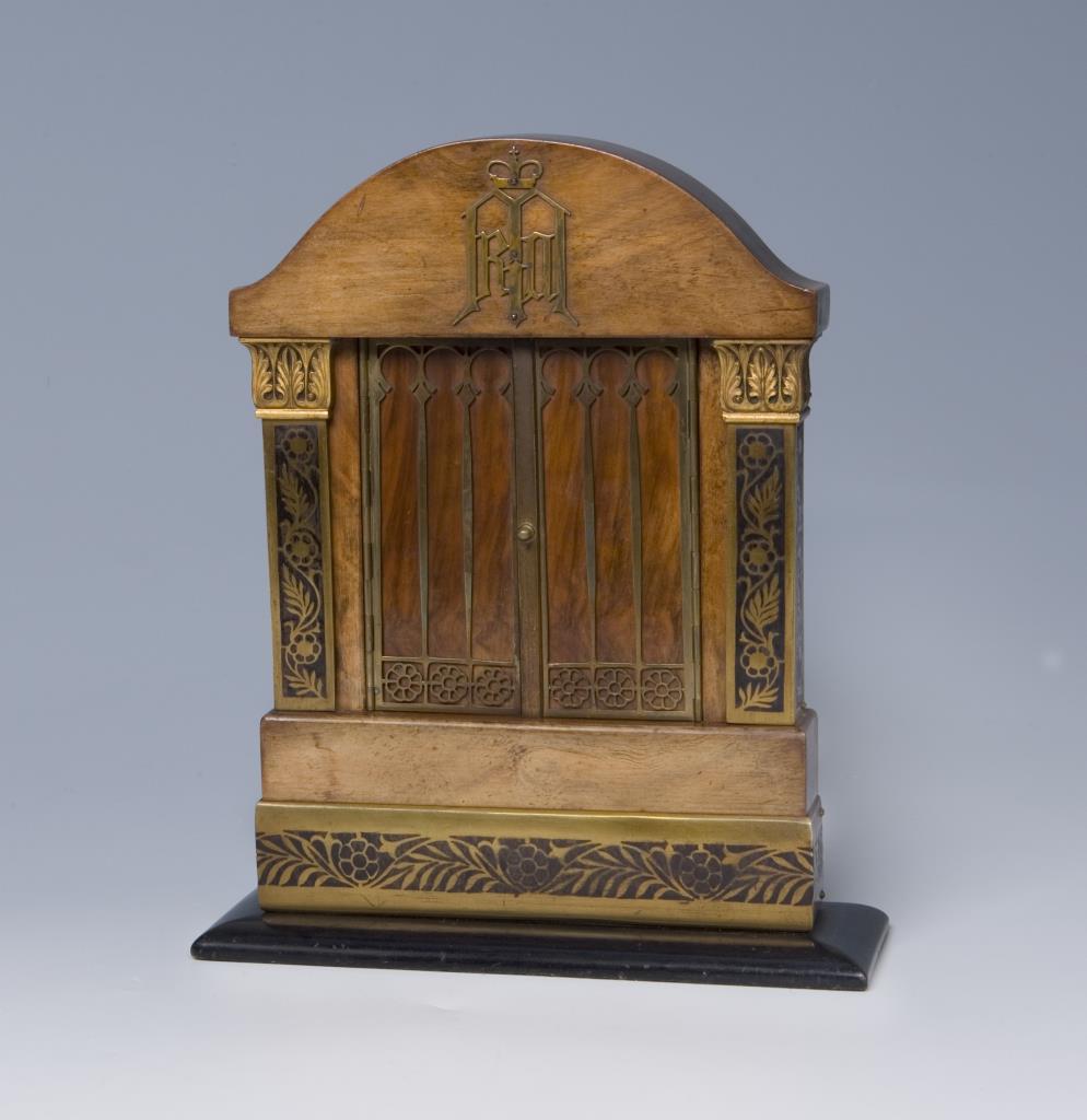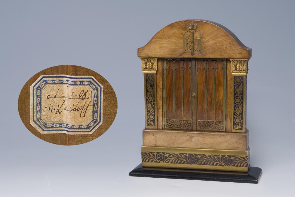 2-türiger Mahagoni-Korpus mit Bronze-Beschlag, partiell geschwärzt. Im Giebel appliziertes bekröntes Monogramm, innen Ikone: Christus Pantokrator, kyrillisch bezeichnet. Rückseitig alter Sammlungs-Klebezettel.